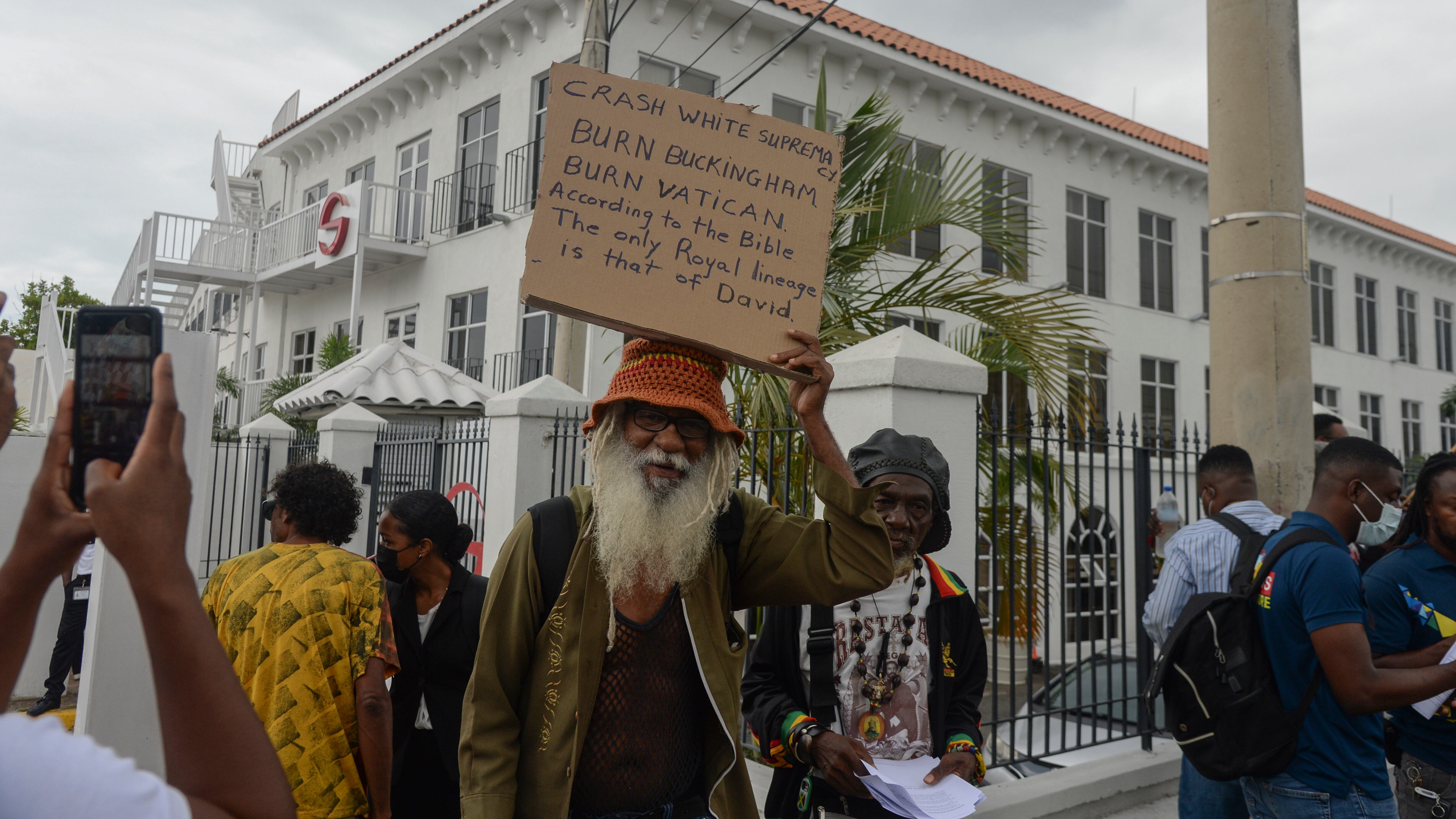 “Los reyes, las reinas, los príncipes y las princesas pertenecen a los cuentos de hadas, ¡no a Jamaica!», decía el cartel de una joven en la protesta.