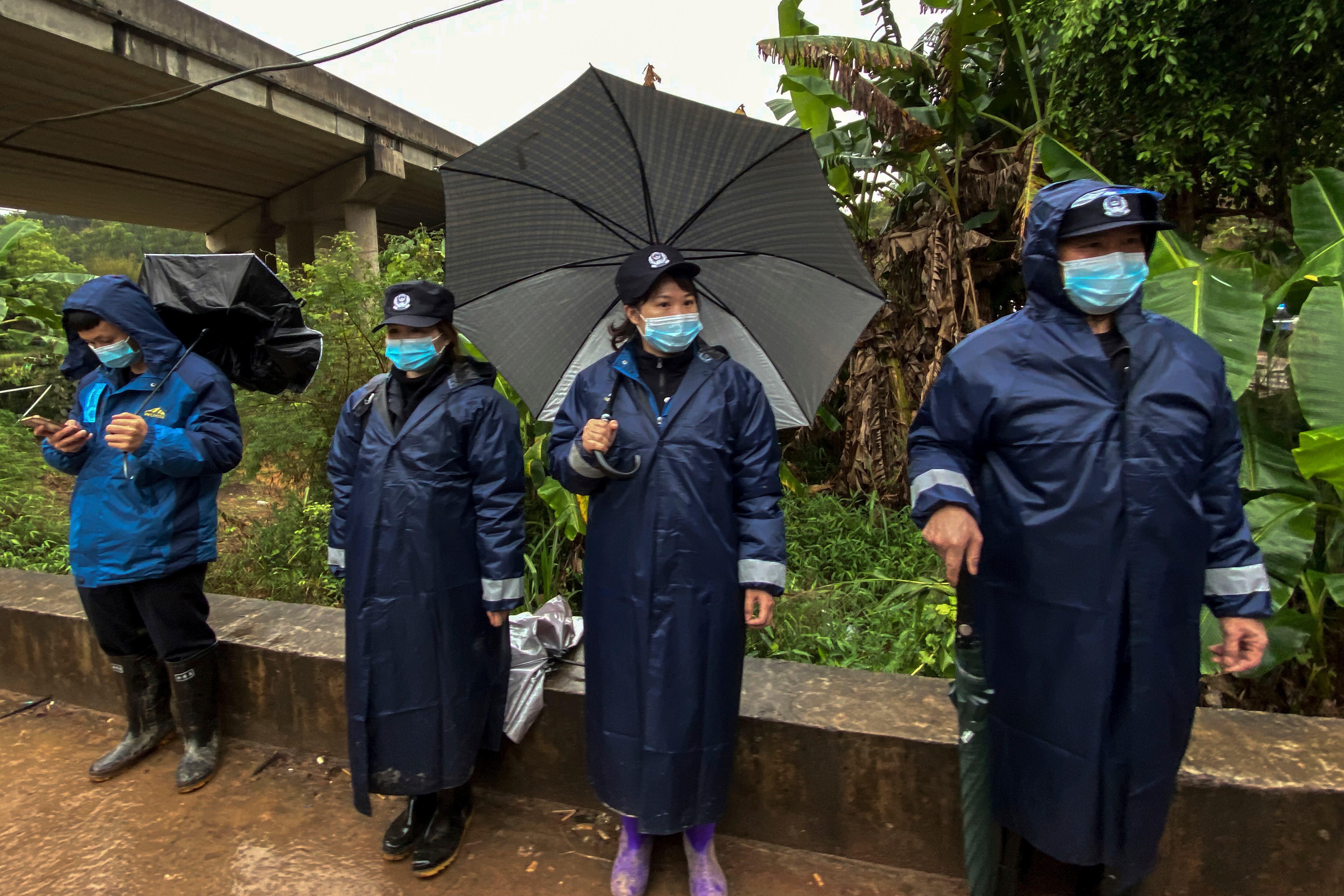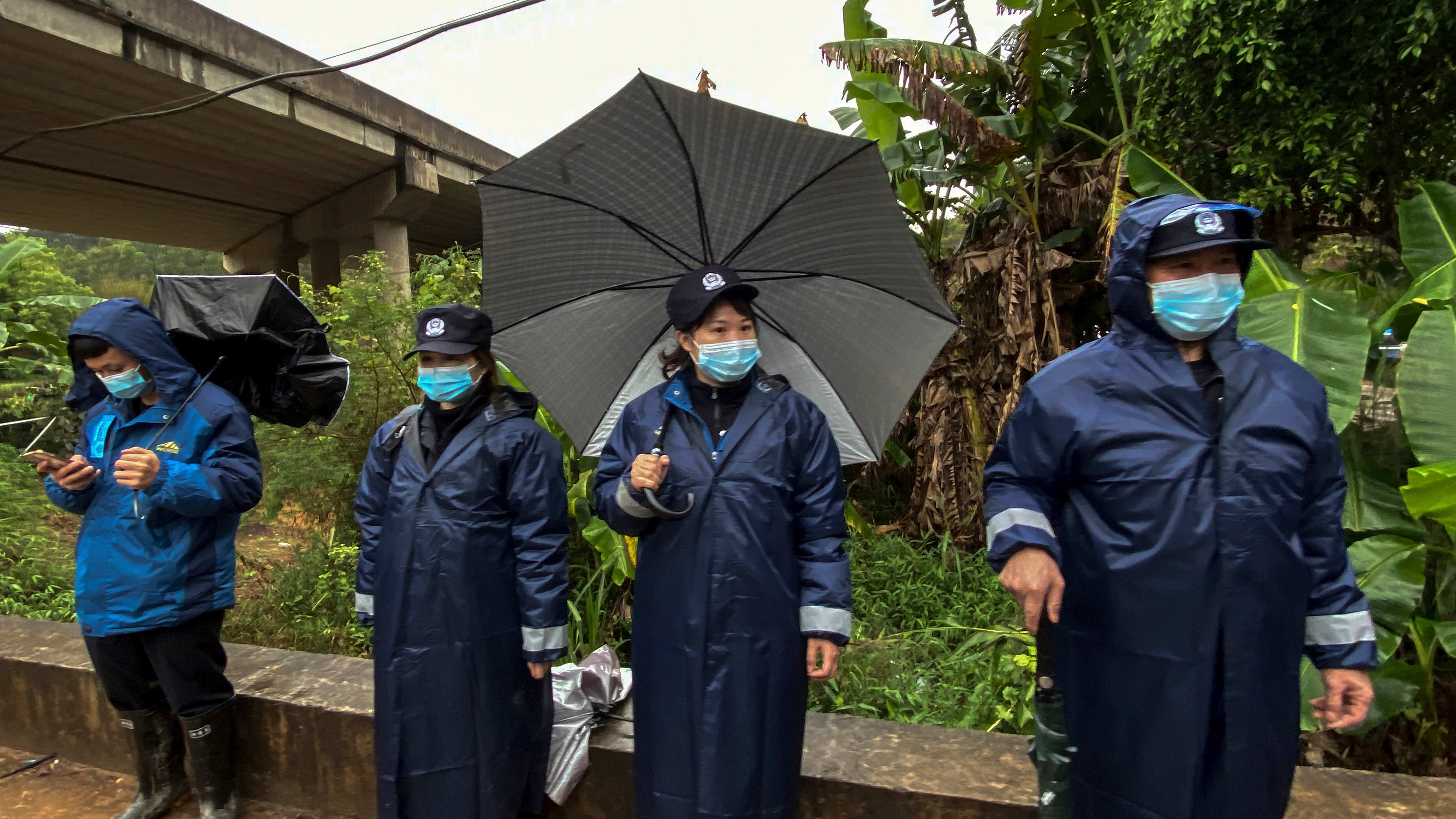 Varios agentes hacen guardia bajo la lluvia en una carretera que lleva a la aldea de Molang, cerca del lugar donde se estrelló el vuelo 5735 de China Eastern, el 24 de marzo de 2022, en la provincia de Guangxi, en el suroeste de China. (AP Foto/Ng Han Gu (Ng Han Guan/AP)