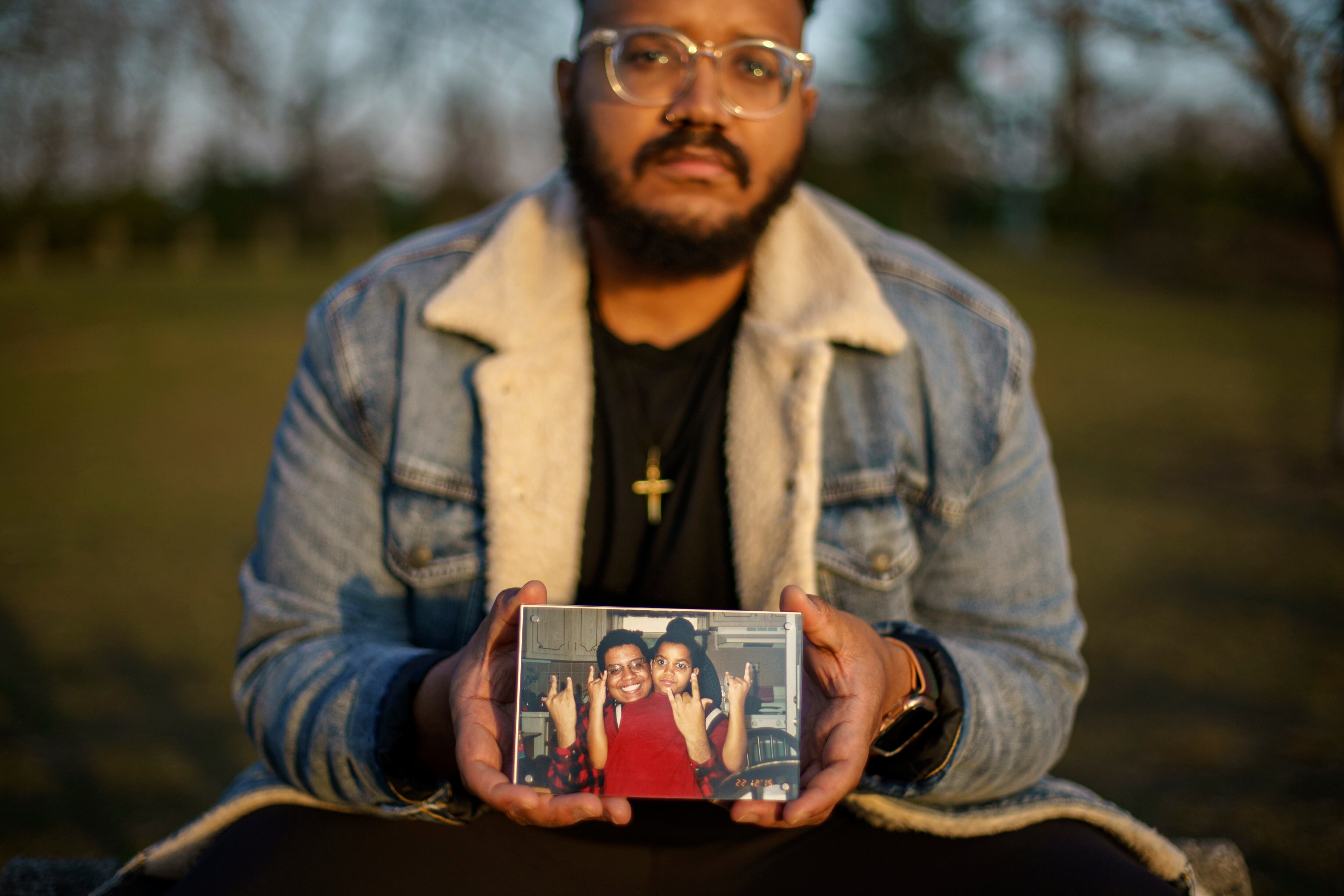 Adam Almonte muestra una foto en la que se lo ve con su hermano mayor, Fernando Morales, el 16 de marzo del 2022 en un parque de Nueva York. Fernando falleció por el COVID-19 en abril del 2020. (AP Photo/David Goldman) (David Goldman/AP)