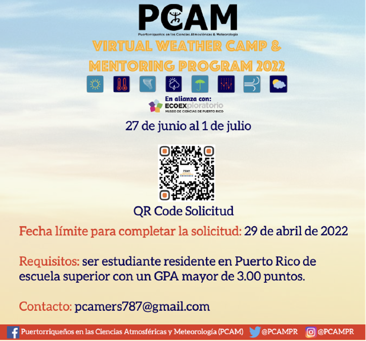 La comunidad científica de Puertorriqueños en las Ciencias Atmosféricas y Meteorología (PCAM) realiza por segundo año consecutivo su campamento de verano en meteorología libre de costo, “Virtual Weather Camp & Mentoring Program 2022″, que se celebrará durante la semana del 27 de junio al 1 de julio a través de la plataforma digital Ciencia Virtual del EcoExploratorio: Museo de Ciencias de Puerto Rico.