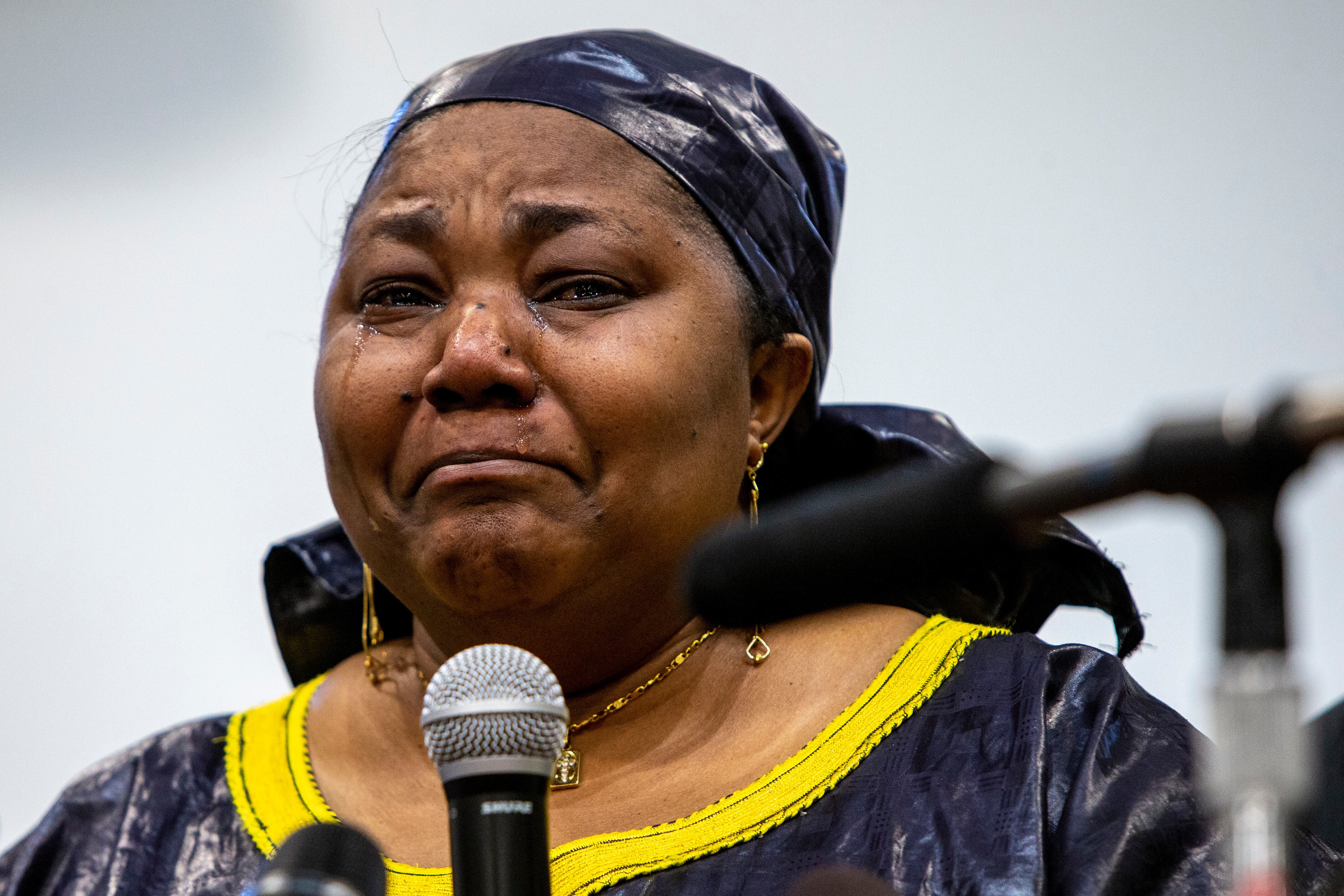 La madre de Patrick Lyoya, Dorcas Lyoya, llora durante una conferencia de prensa en Grand Rapids, Michigan, 14 de abril de 2022. (Cory Morse/The Grand Rapids Press via AP) (Cory Morse | MLive.com/AP)