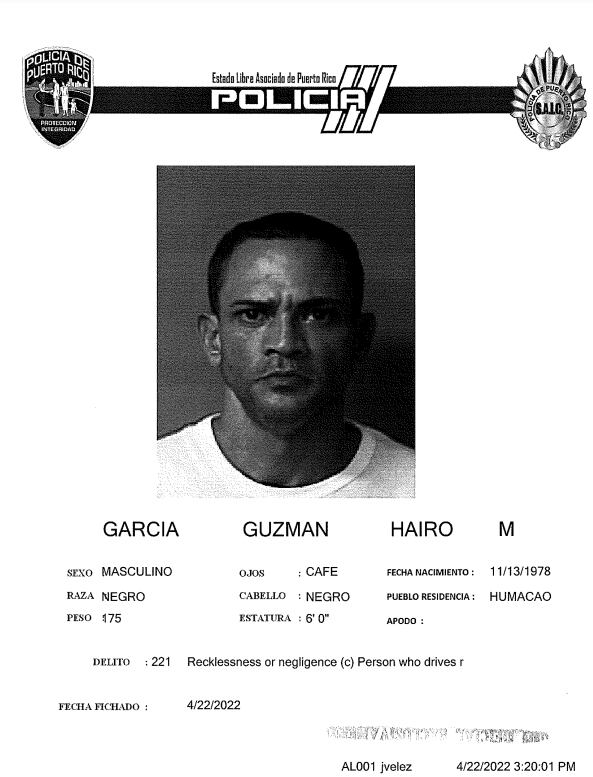 Contra Hairo García Guzmán, de 42 años, pesaba una orden de arresto por violación al artículo 5.07 (Imprudencia o Negligencia al conducir un vehículo de motor) de la Ley 22 con una fianza de 50 mil dólares.