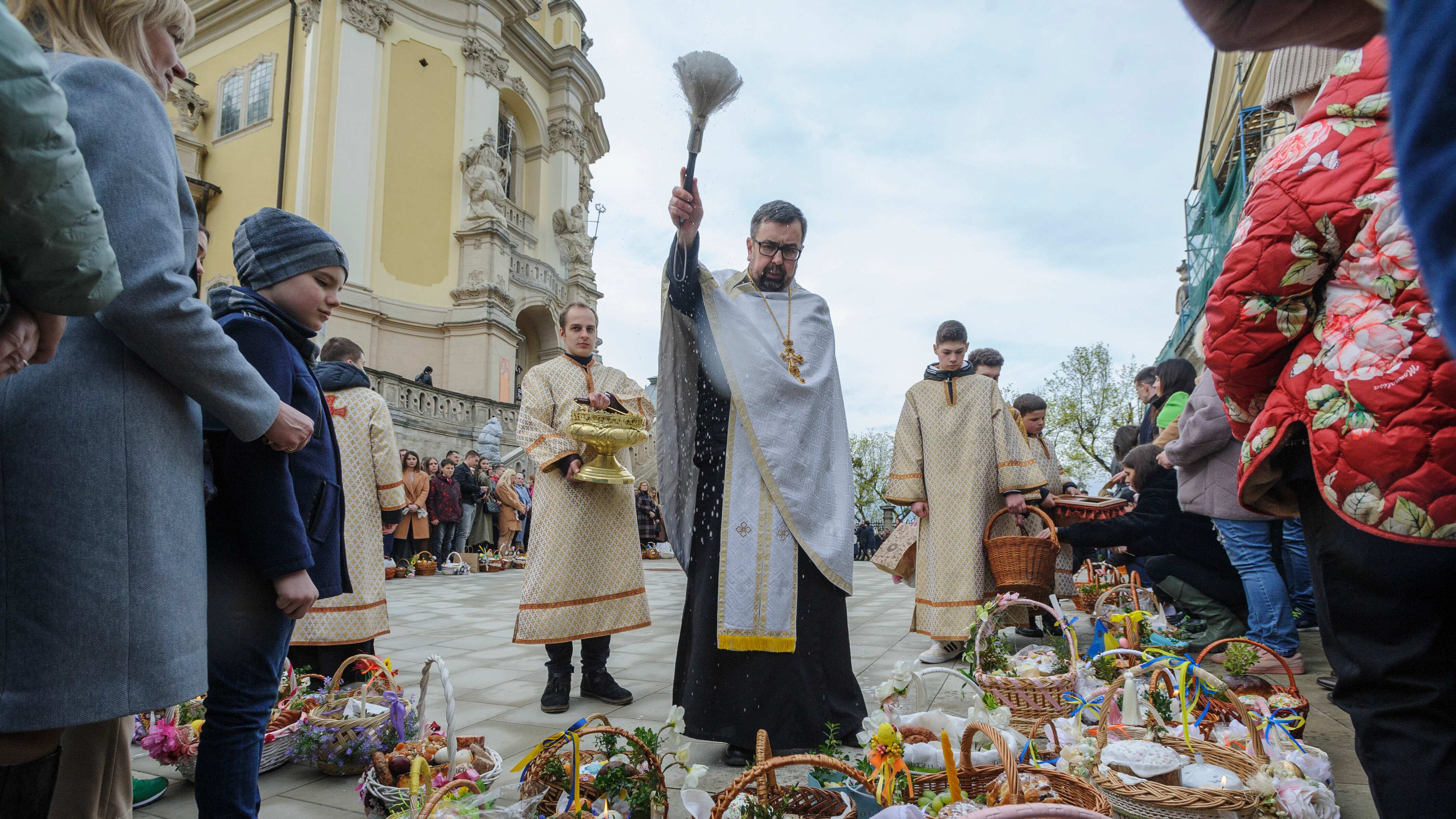 Cientos de feligreses acudieron a la Catedral de San Volodymyr, en Kiev, con cestas para bendecir. En el templo, un mujer aferraba el brazo de un soldado y se giró un momento para darle un beso en el codo. Otros soldados rezaban con un puñado de velas en la mano, antes de santiguarse. Una anciana avanzaba despacio entre la multitud y los soportes de velas encendidas. Una joven sostenía un ramo de narcisos.