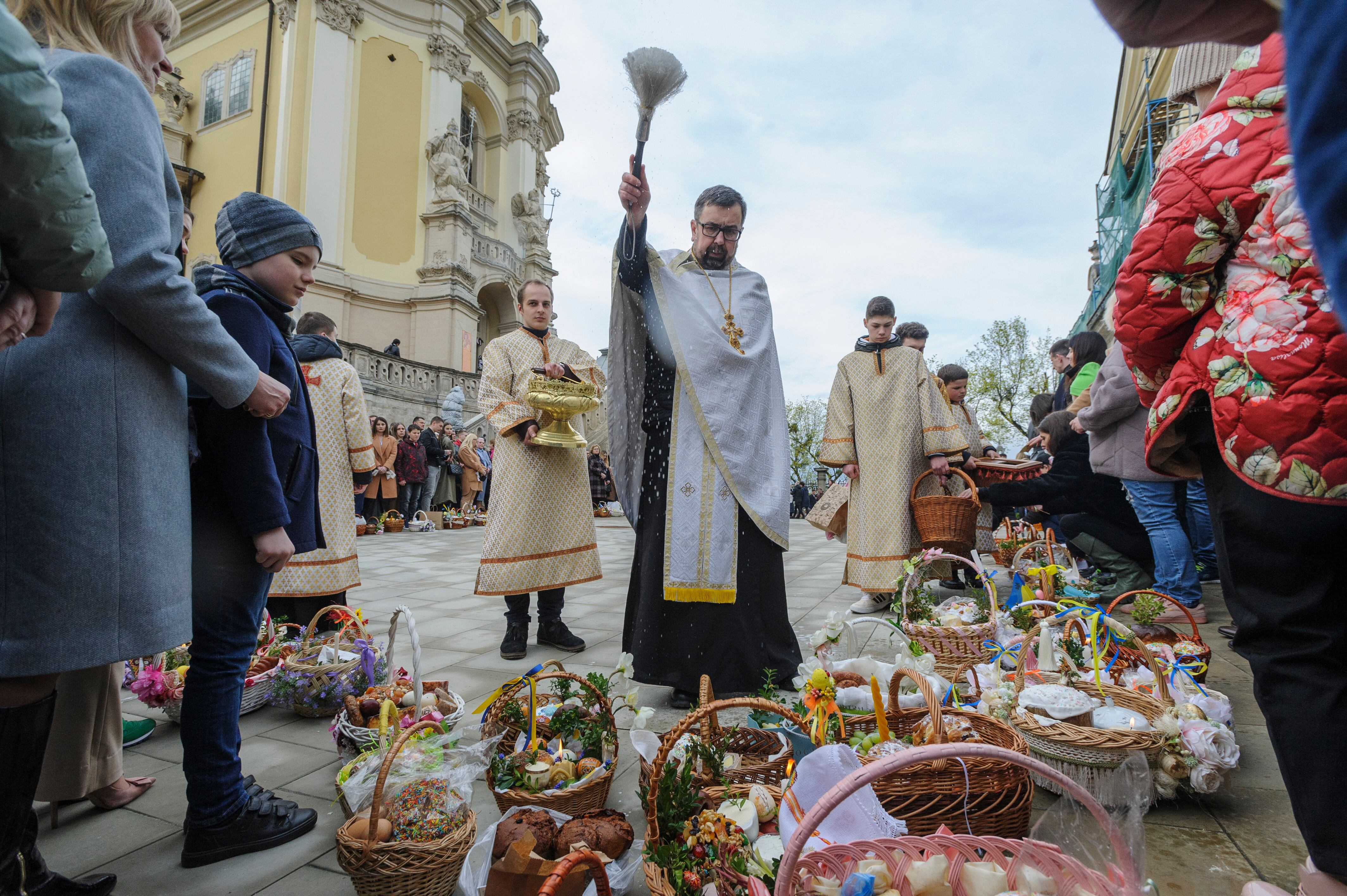 Cientos de feligreses acudieron a la Catedral de San Volodymyr, en Kiev, con cestas para bendecir. En el templo, un mujer aferraba el brazo de un soldado y se giró un momento para darle un beso en el codo. Otros soldados rezaban con un puñado de velas en la mano, antes de santiguarse. Una anciana avanzaba despacio entre la multitud y los soportes de velas encendidas. Una joven sostenía un ramo de narcisos.