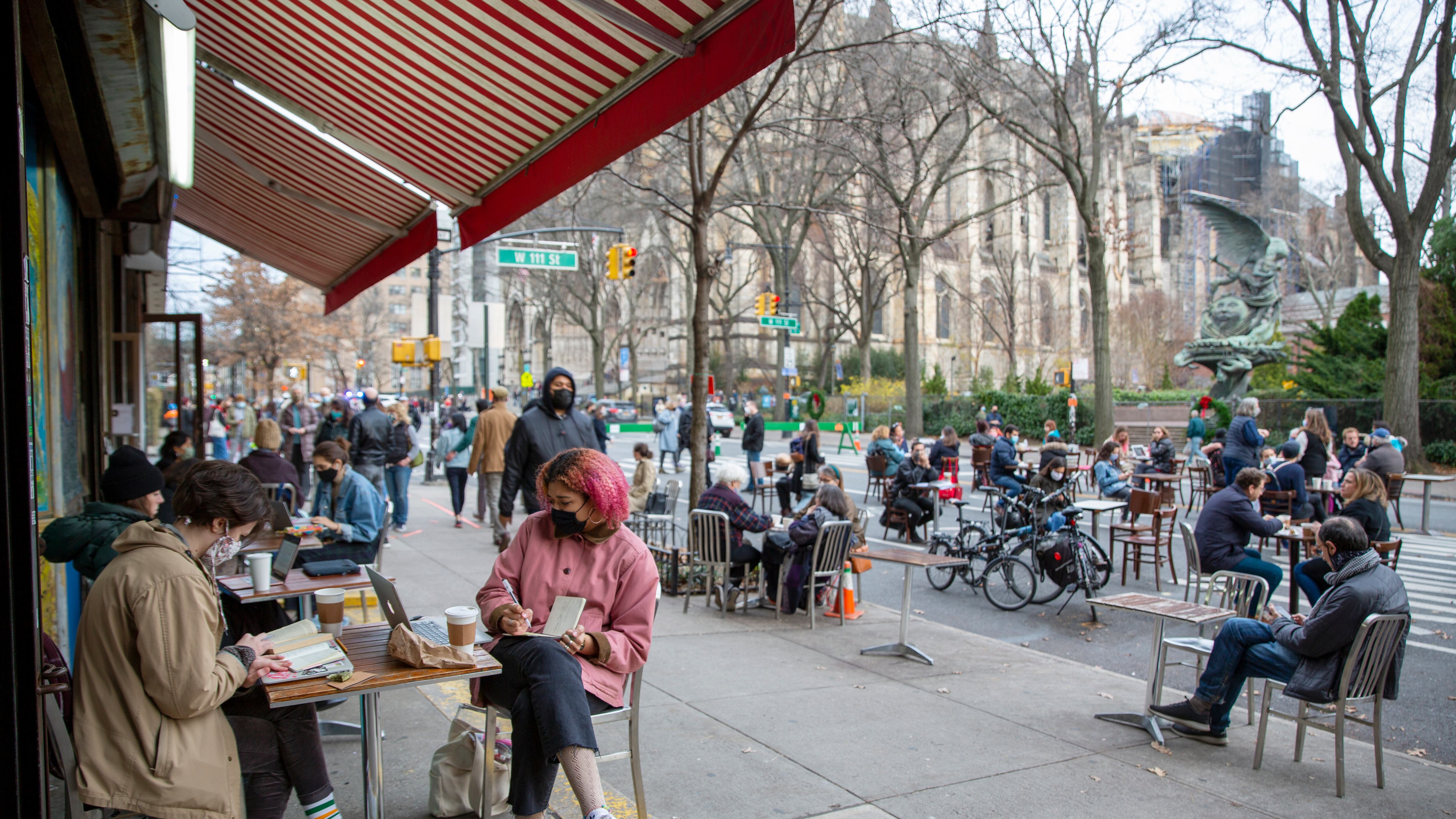 A pesar de que ya no se piden mascarillas ni comprobantes de vacunación para los espacios cerrados de los restaurantes, las terrazas para cenar al aire libre, instaladas en antiguos carriles de estacionamiento, nunca han sido más abundantes.