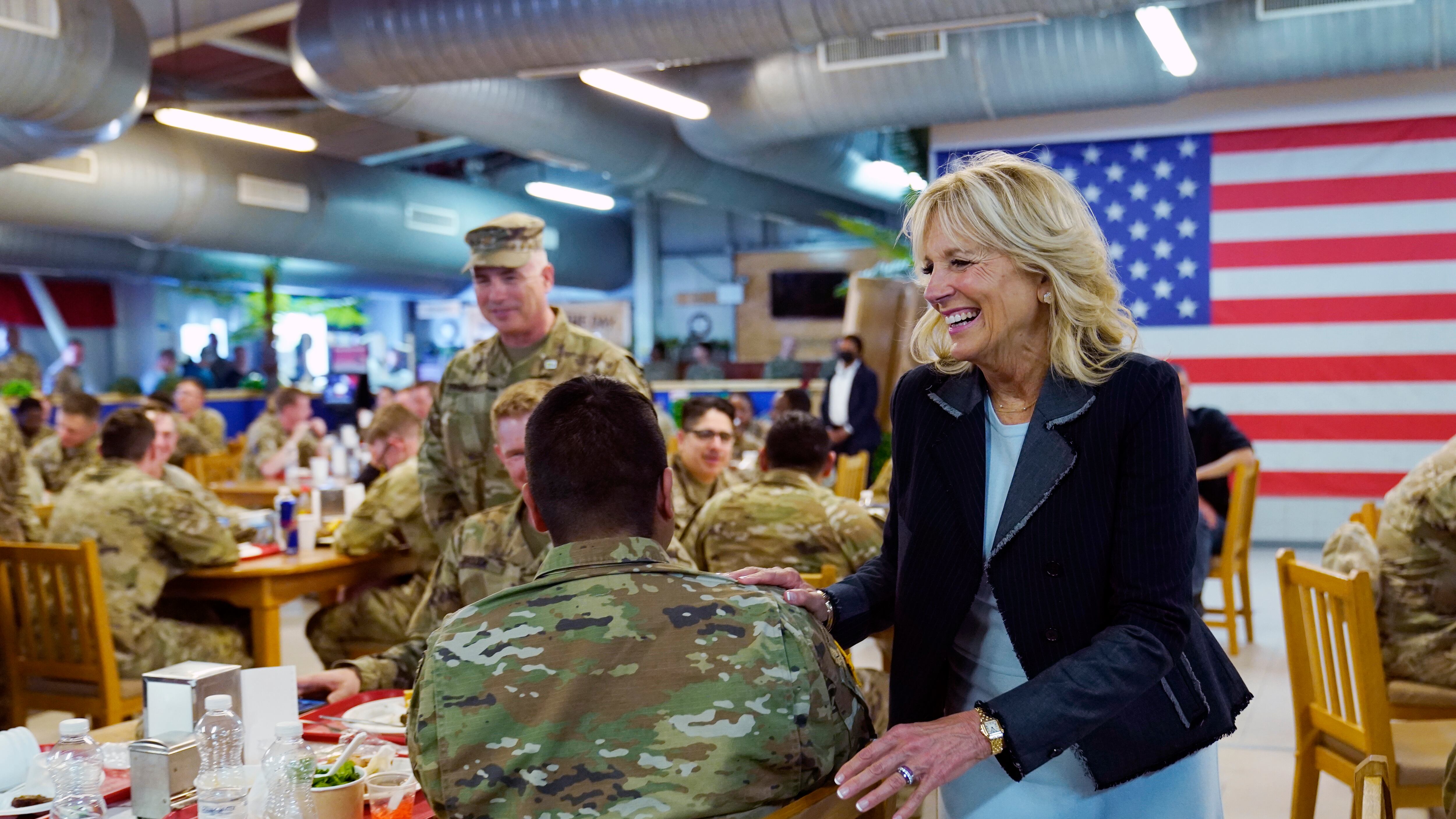 Tras volar desde Washington por la noche, la primera dama arribó a la Base Aérea Mihail Kogalniceau en Rumania, cerca del Mar Negro, a tiempo para ayudar a servir la cena a los soldados estadounidenses estacionados allí. Unos 1.600 de los varios miles de soldados desplegados por el presidente Joe Biden en el este de Europa antes de la guerra Rusia-Ucrania fueron enviados a la base, que está a unos 100 kilómetros (60 millas) de la frontera con Ucrania.