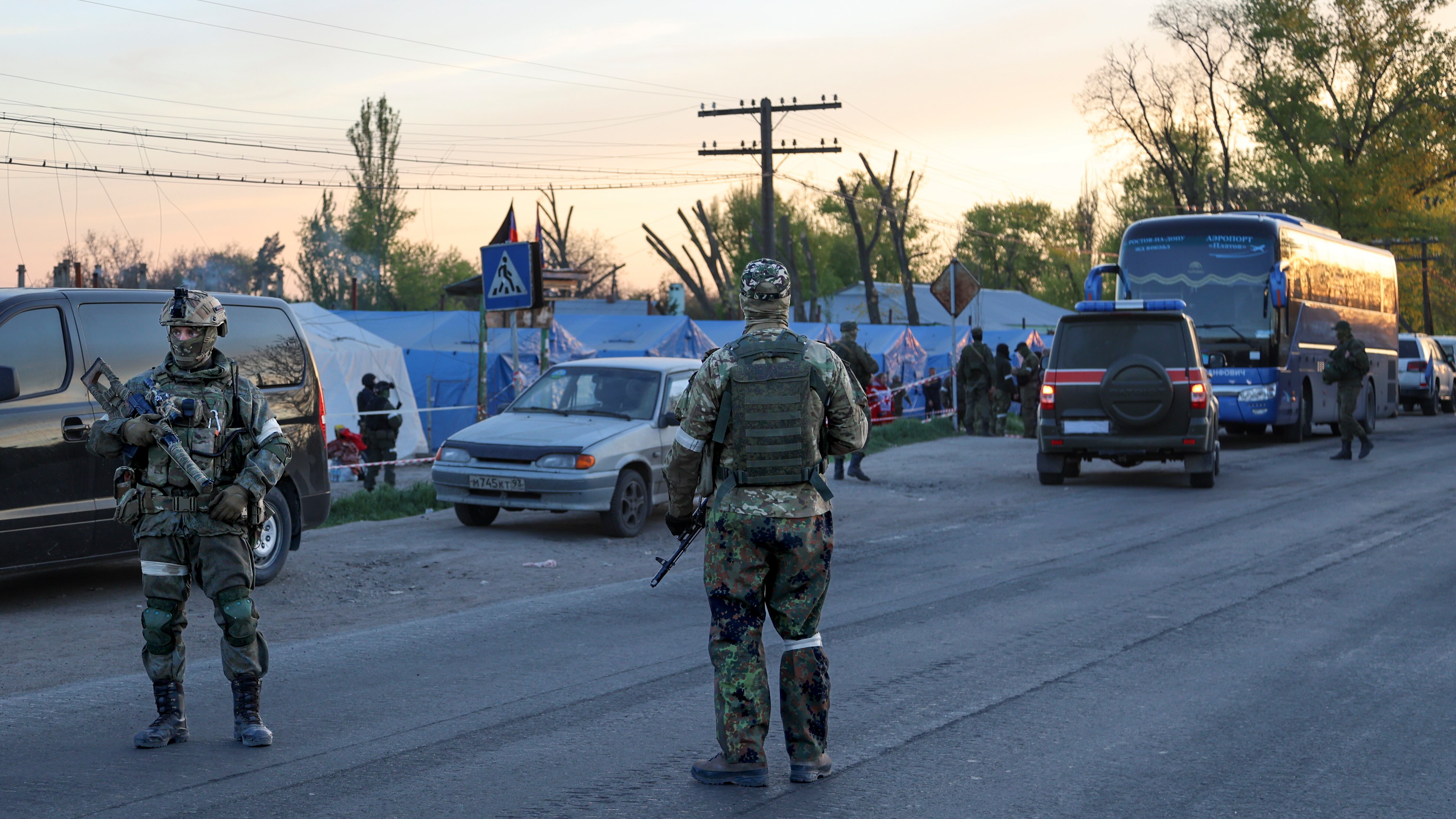 Soldados rusos y combatientes de la República Popular de Donetsk custodian el campamento en el que residentes locales que dejaron su refugio en la siderúrgica de Azovstal se están quedando temporalmente, el viernes 6 de mayo de 2022, en Bezimenne, un t (Alexei Alexandrov/AP)