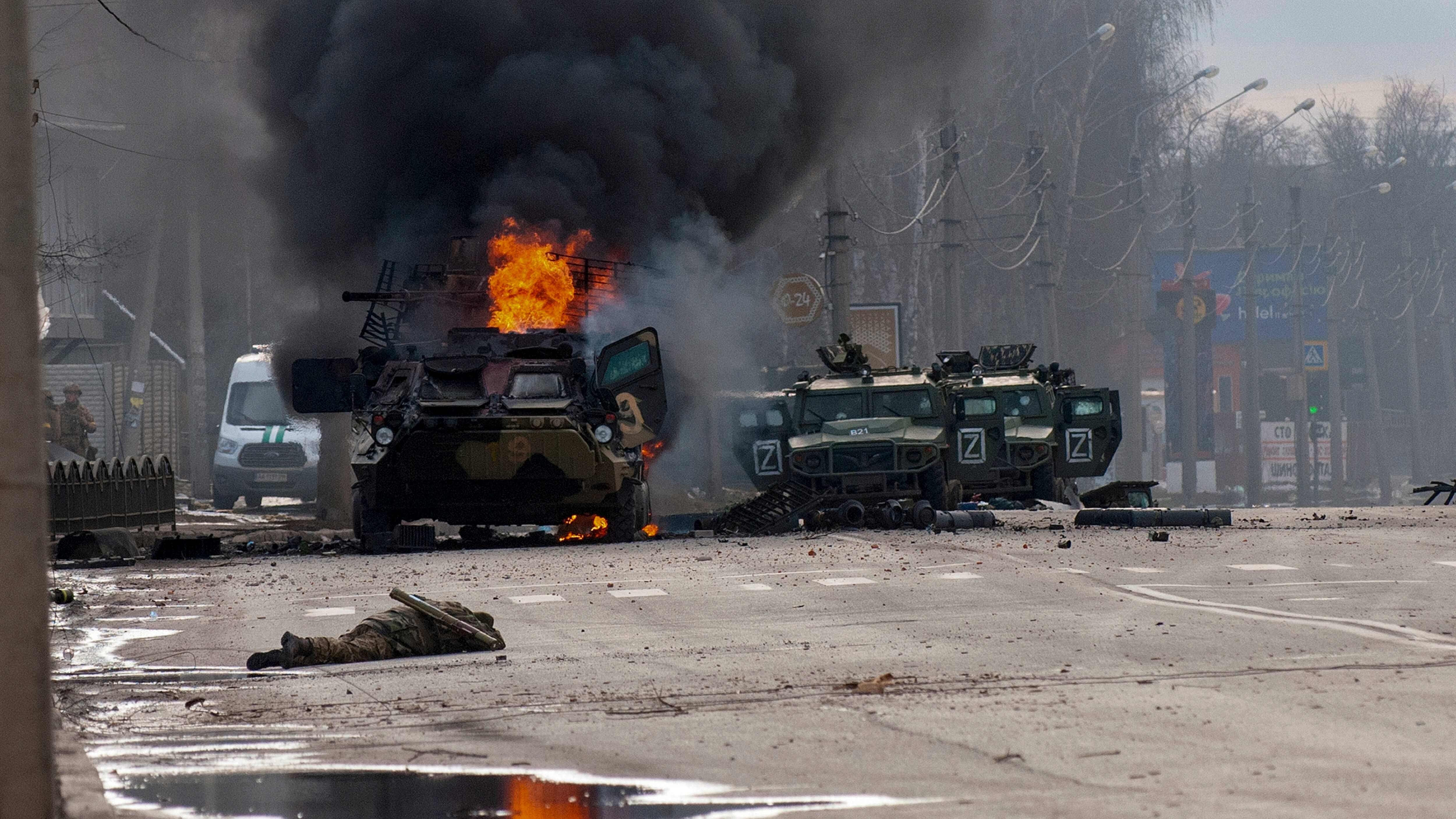 En lugar de eso, las tropas rusas se quedaron trabadas a las afueras de Kiev y otras grandes ciudades ante una firme defensa ucraniana. Convoyes de blindados rusos se veían paralizados en largos tramos de autopista. Las tropas se quedaban sin suministros ni gasolina y se convirtieron en objetivos fáciles desde aire y tierra.