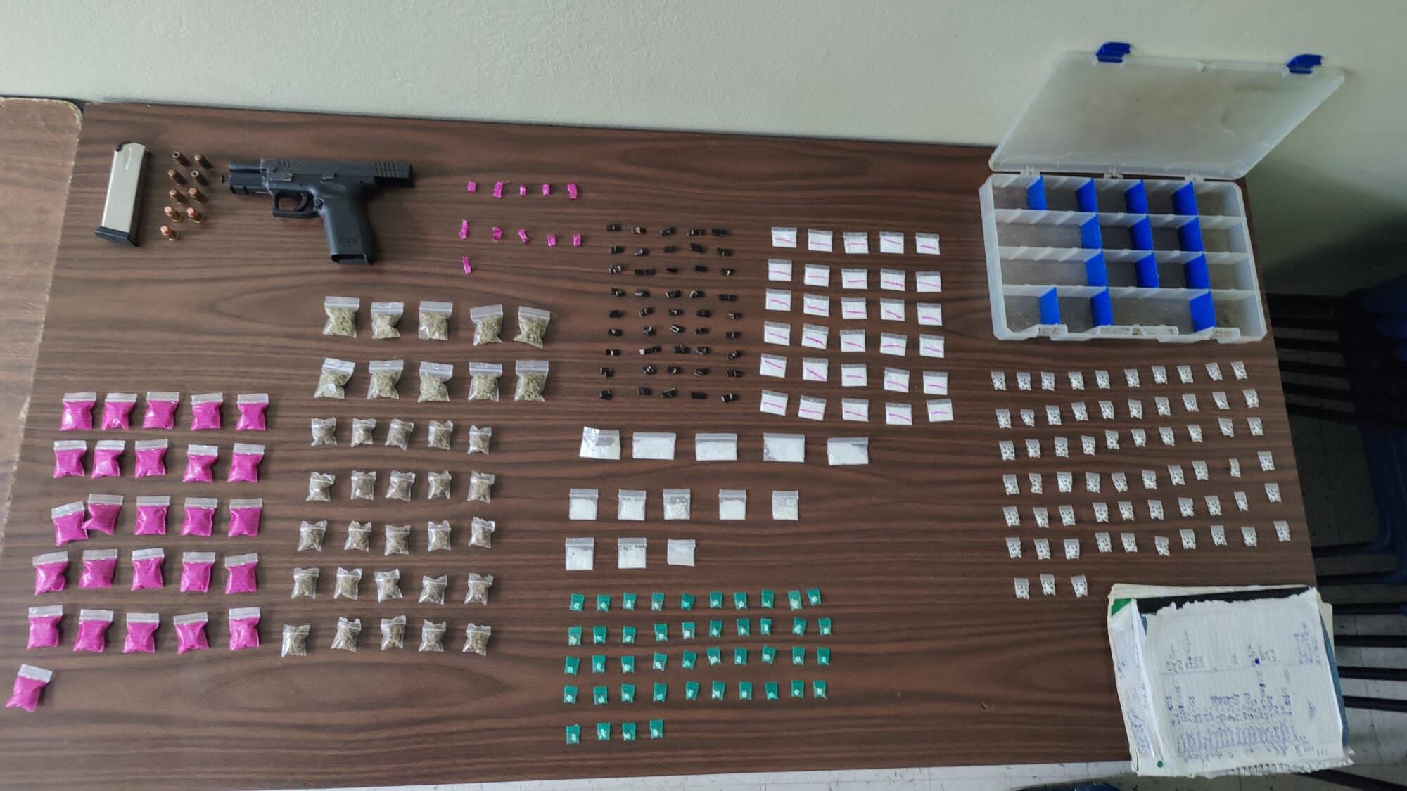 Al momento del arresto, al hombre, identificado como Edgar Méndez Colon, de 30 años, se le ocupó una pistola Springfield modelo XD calibre .40 hurtada en el pueblo de Cabo Rojo; un cargador con 9 municiones del mismo calibre; 43 bolsitas de cocaína; 107 bolsitas de crack; 61 bolistas de marihuana; 56 decks de heroína, de diferente colores y tamaños; y $429 en efectivo.