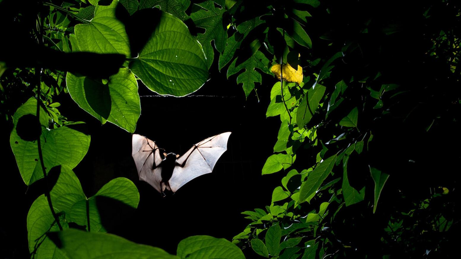 Esta fotografía muestra a un murciélago frutero indio entrando por un agujero en la copa de un árbol y enmarcado perfectamente en un anillo de exuberante follaje verde. / Sitaram Raul.