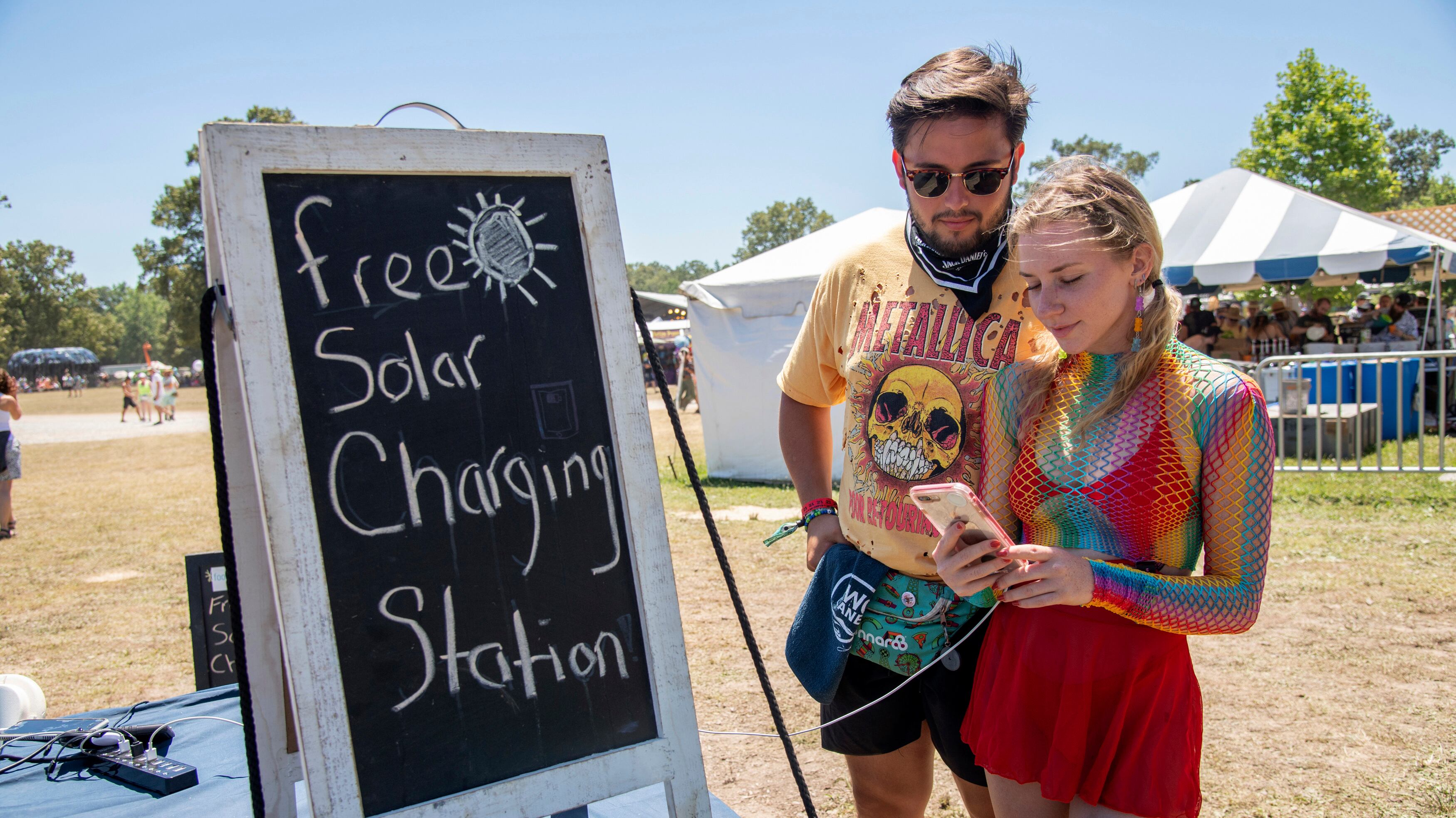 Cerca, media docena de campistas estaban sentados y dormitando bajo el sol de la tarde mientras cargaban sus teléfonos celulares mediante un panel solar. En una cena de recaudación de fondos, los asistentes al festival recibieron una comida de cuatro platos de origen local preparada por chefs que utilizan una cocina con energía solar. Desde un escenario alimentado por energía solar, la música sonaba de fondo mientras los fanáticos devoraban verduras frescas en escabeche, sémola y pastel de crema y plátano.