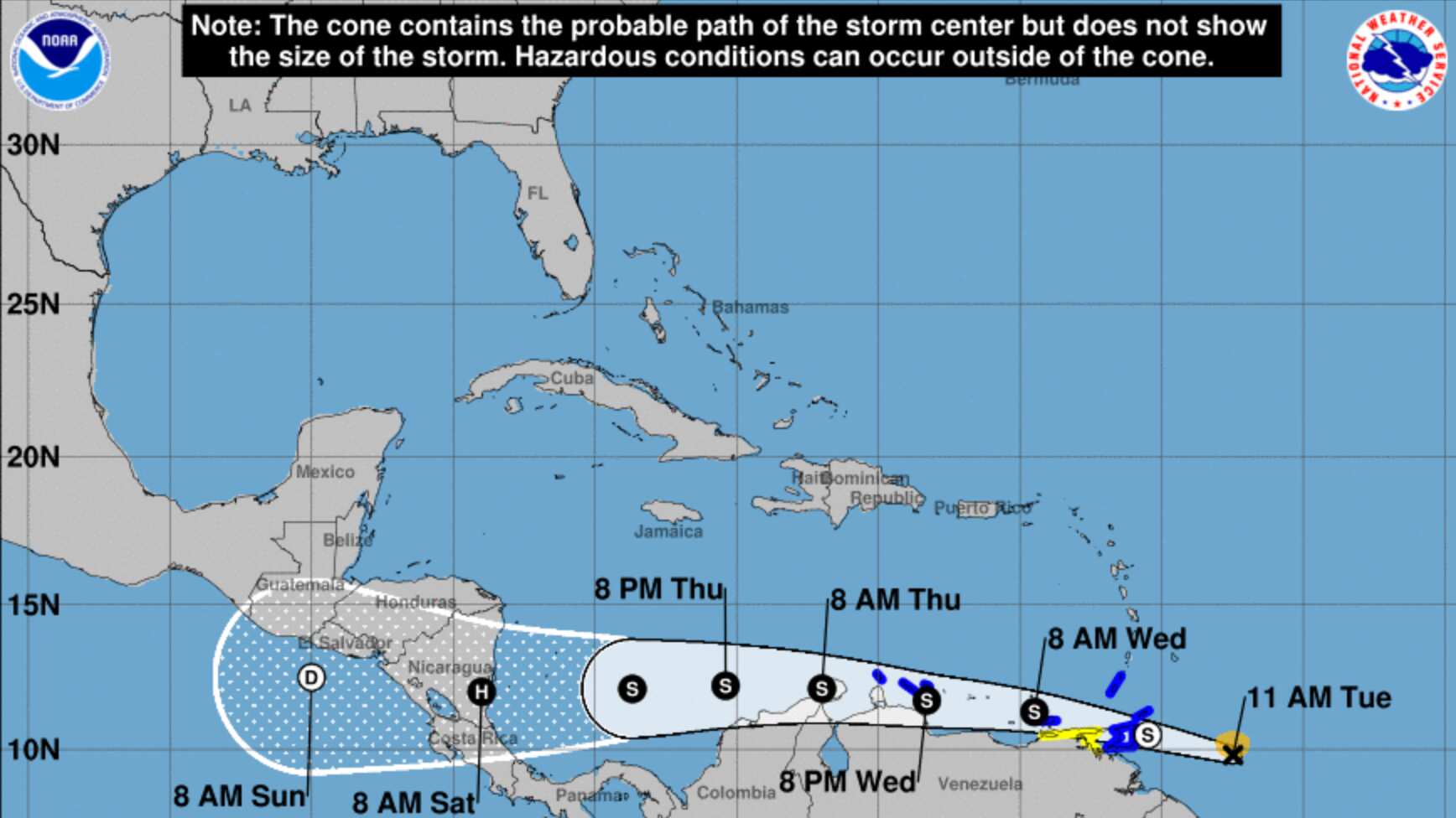 El martes en la mañana la tormenta estaba a 430 kilómetros (260 millas) al este de Trinidad y se dirigía hacia el oeste a 37 kilómetros por hora (23 millas por hora) con vientos máximos sostenidos de 65 km/h (40 mph).
