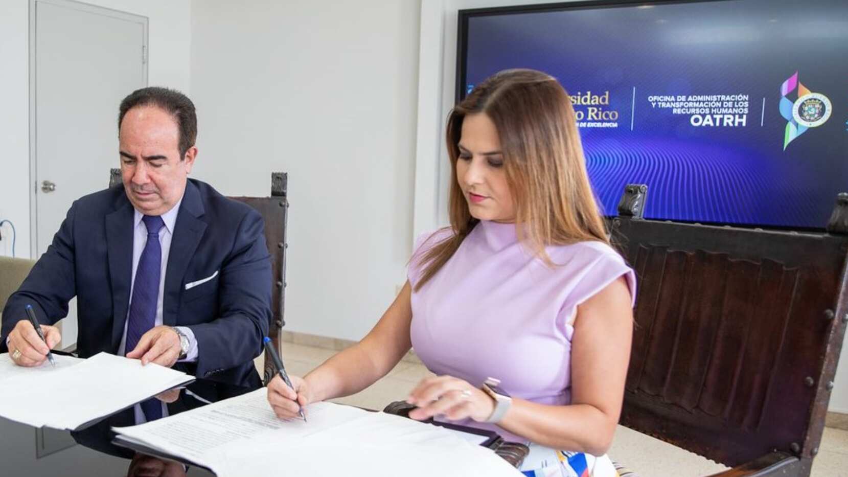 La directora de la Oficina de Administración y Transformación de los Recursos Humanos del Gobierno de Puerto Rico (OATRH), Zahira Maldonado Molina, firmó hoy, viernes, un acuerdo con el presidente de la Universidad de Puerto Rico (UPR), Luis Ferrao, para continuar la profesionalización de los servidores públicos de la Rama Ejecutiva.