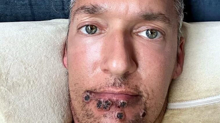 El hombre manifestó que al principio creyó tener solo un grano, sin embargo, pronto comenzó a tener sarpullido por toda su cara. Tiene ocho lesiones diferentes en el mentón, e incluso una en la boca.