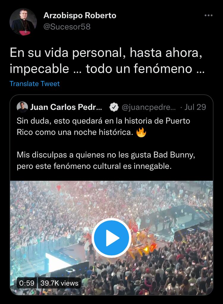 El arzobispo de San Juan, Roberto González Nieves, escribió hoy, en su cuenta de Twitter, que considera a Bad Bunny como “impecable”, en relación a su vida personal.