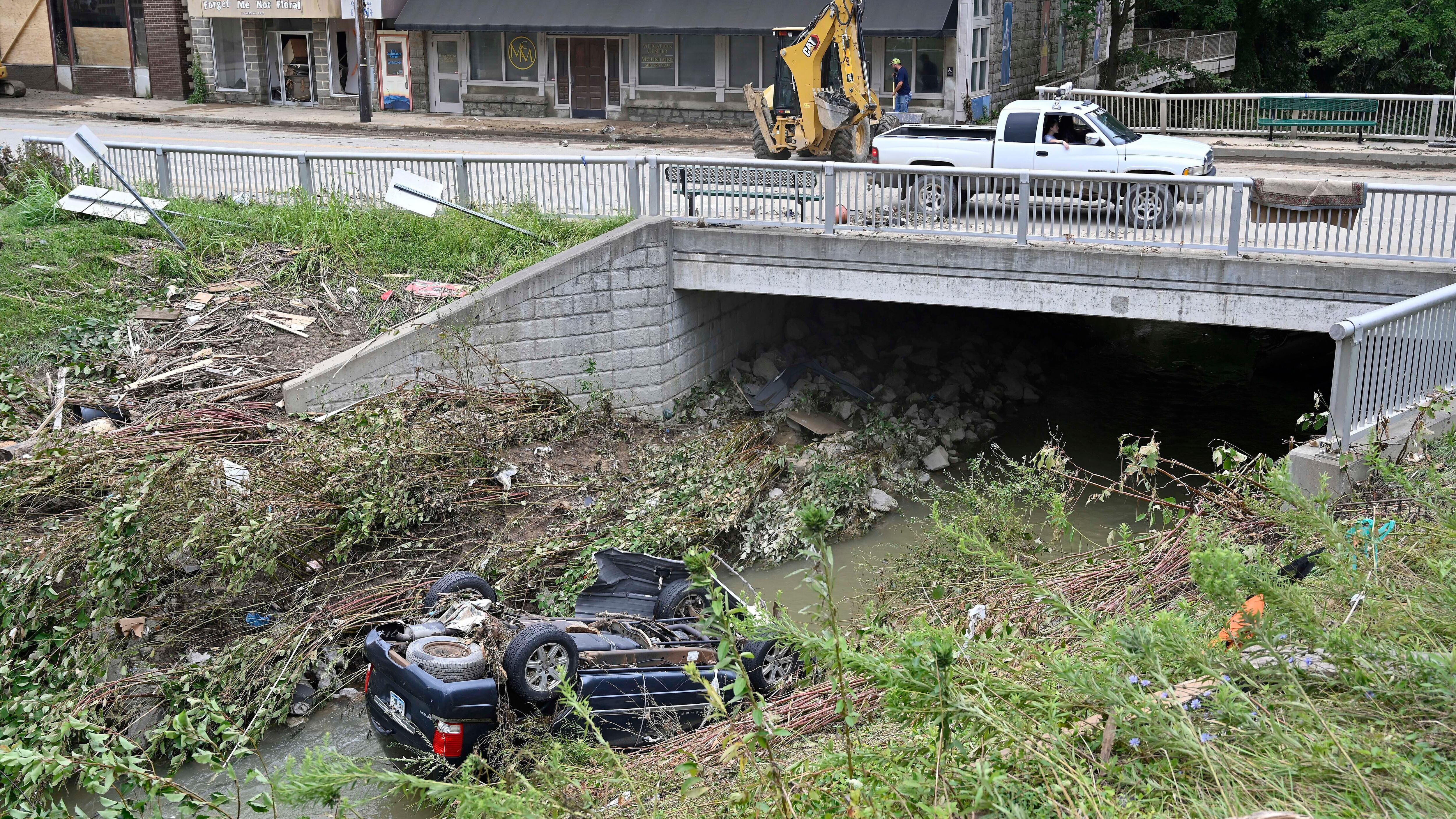 En una mañana nublada en el centro de Hindman, a unos 322 kilómetros (200 millas) al sureste de Louisville, un equipo limpiaba los escombros apilados en los escaparates. Cerca de allí, un vehículo se encontraba en el arroyo Troublesome Creek, que había vuelto a su cauce lleno de escombros.
