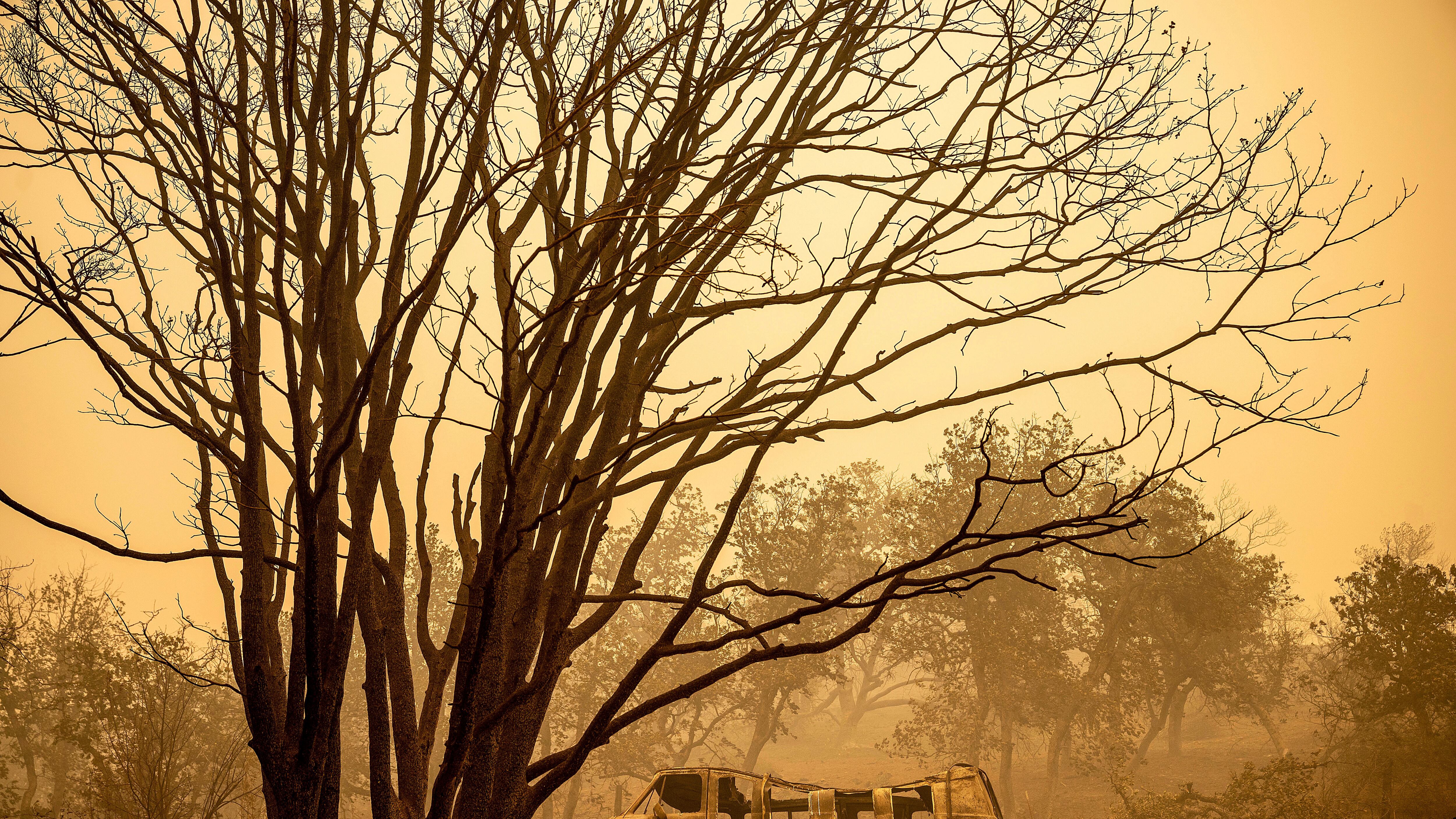 Las llamas y el humo tiñeron de naranja y marrón el cielo sobre un vecindario donde una chimenea se erguía entre los escombros y los vehículos calcinados el domingo. Las llamas cubrían los árboles por la Carretera Estatal 96 y se adentraban a las colinas, no muy lejos de varias casas.
