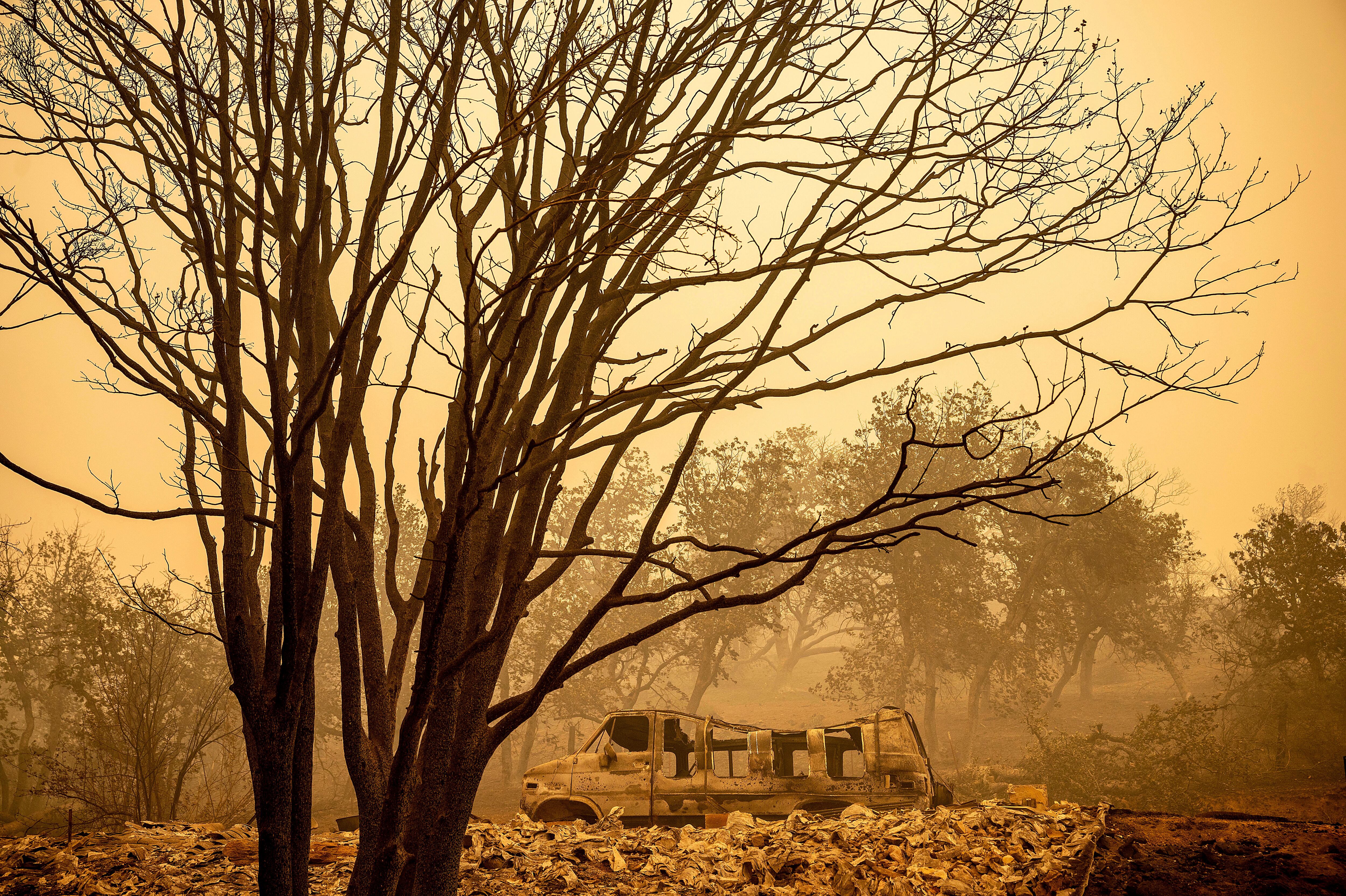Las llamas y el humo tiñeron de naranja y marrón el cielo sobre un vecindario donde una chimenea se erguía entre los escombros y los vehículos calcinados el domingo. Las llamas cubrían los árboles por la Carretera Estatal 96 y se adentraban a las colinas, no muy lejos de varias casas.