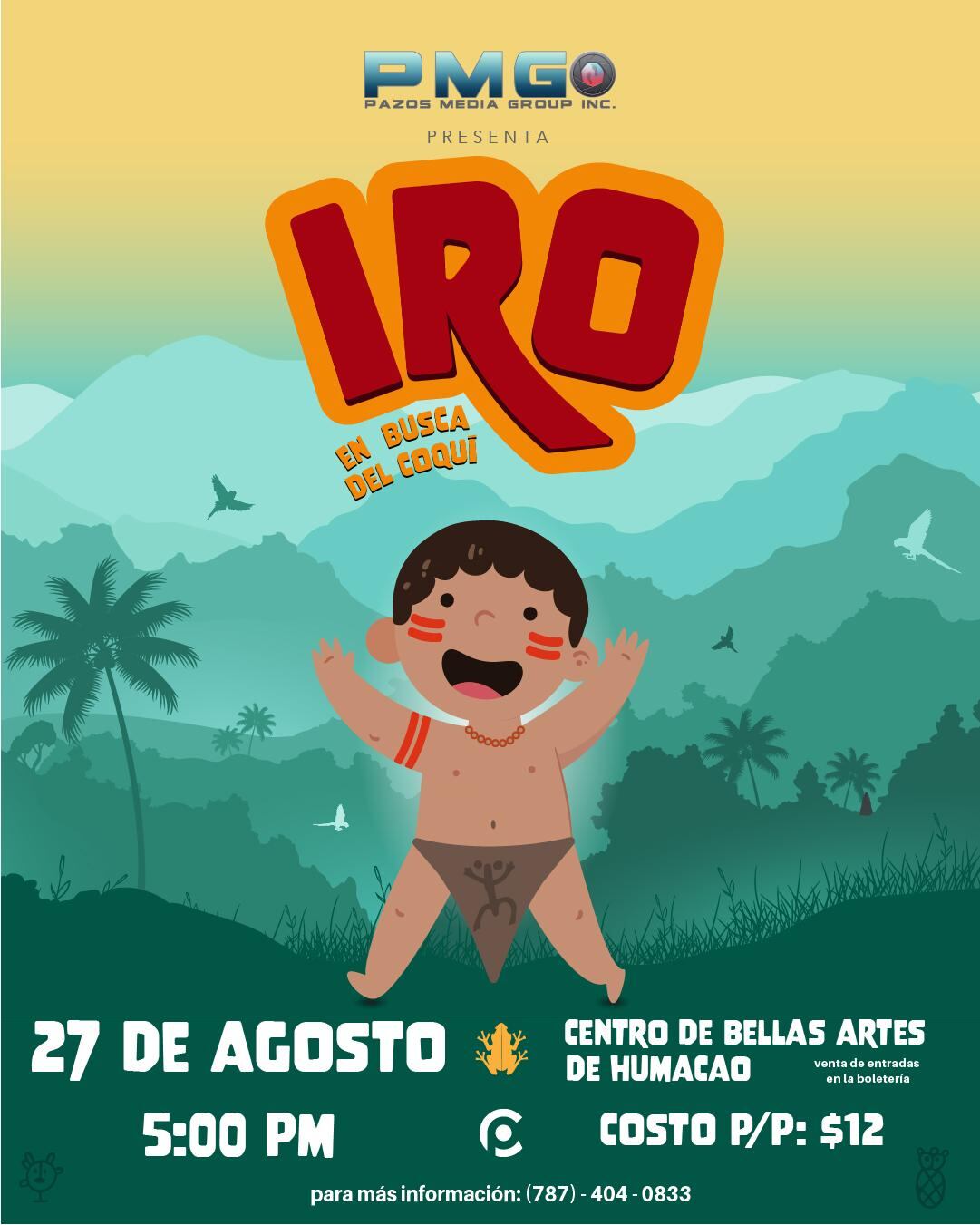 El productor Eric Jomar García Ortiz, de Pazos Media Group, dio a conocer que presentarán el sábado, 27 de agosto, a las 5:00 de la tarde, la obra infantil, IRO en Busca del Coquí, en el Centro de Bellas Artes de Humacao Aguedo Mojica Marrero (CBA).