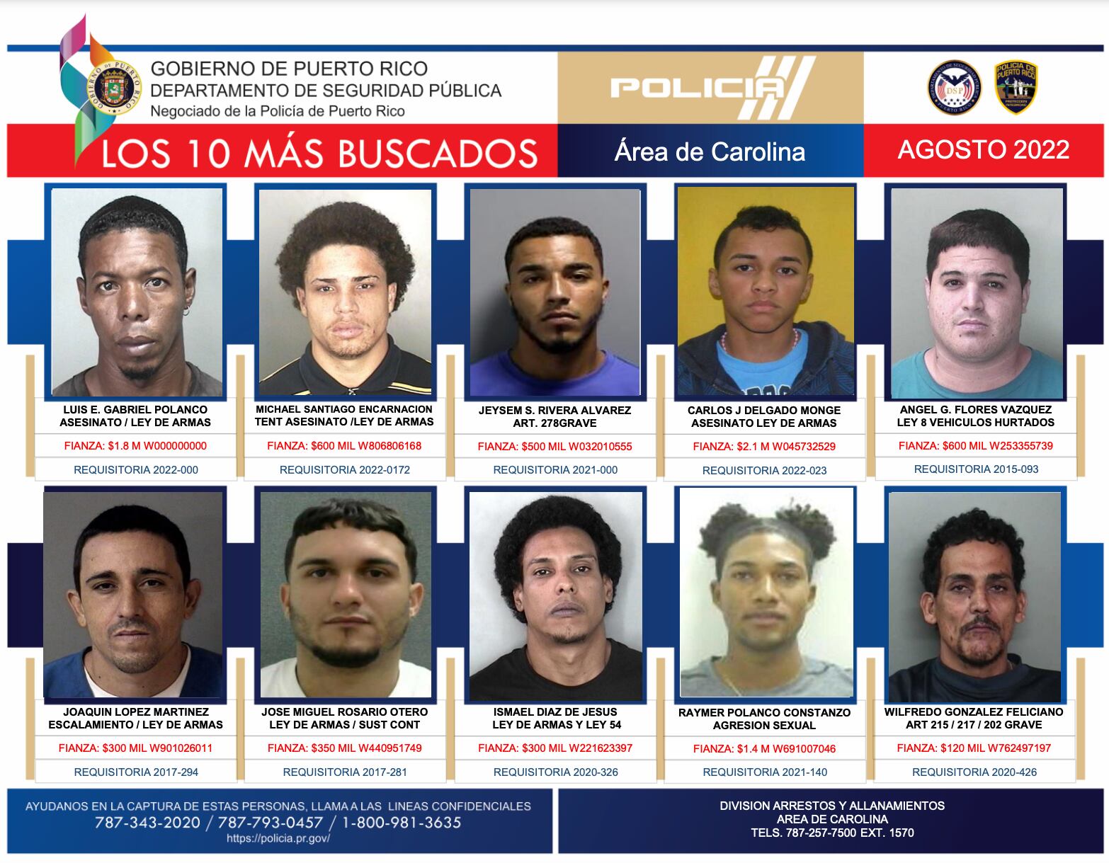 La División de Arrestos Especiales y Allanamientos de Carolina, publicó hoy, domingo, la nueva lista de “Los 10 más Buscados”.