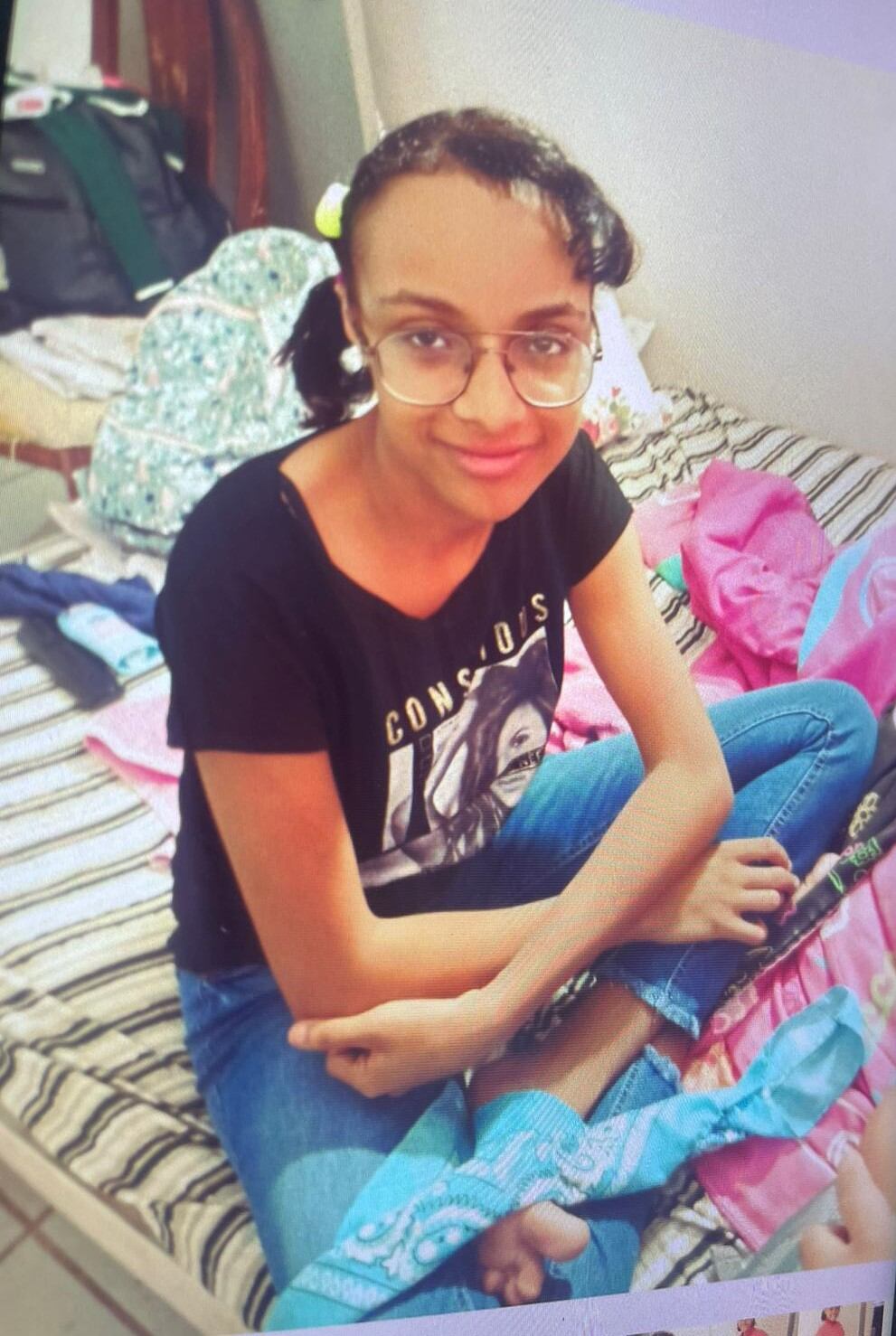 Al momento de su desaparición, la joven vestía una camiseta blanca con pintas azules, falda marrón y calzado deportivo color negro.