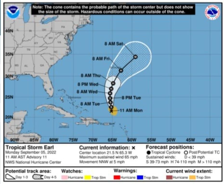 El Servicio Nacional de Meteorología informó que la tormenta tropical Earl se encuentra al norte de la isla de San Thomas con vientos de 65 millas por hora.
