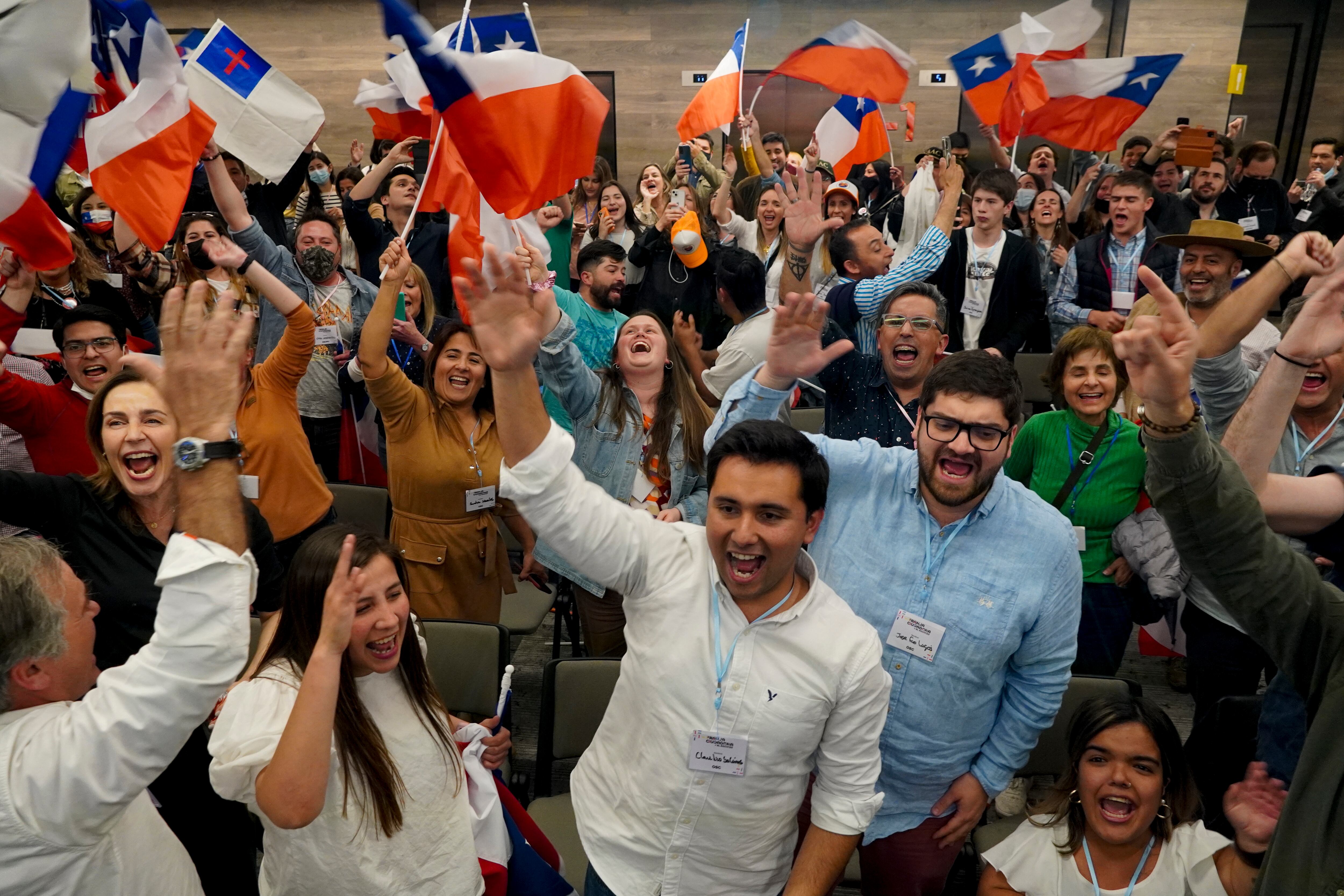 Los opositores a la nueva Constitución aplauden mientras escuchan los resultados parciales de un plebiscito que daban la ventaja a la opción del "Rechazo" al nuevo texto constitucional, en Santiago, Chile, el domingo 4 de septiembre de 2022. ( Foto AP/Matías Basualdo) (Matias Basualdo/AP)