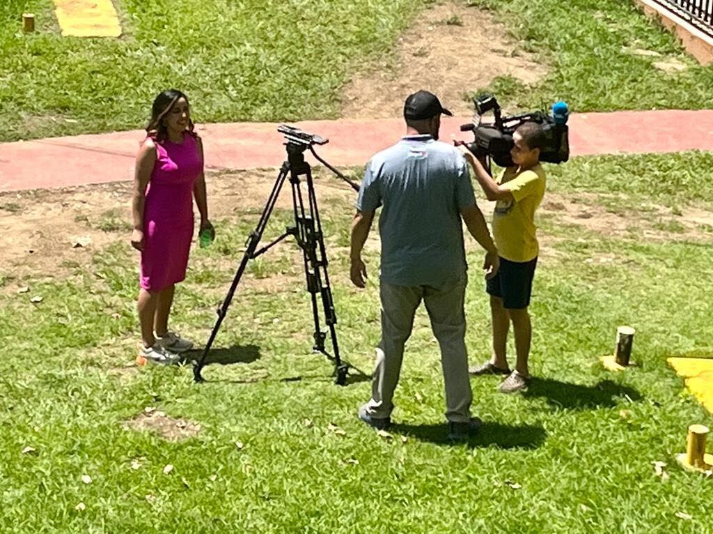 En la fotografía se puede ver al joven cargando la cámara del canal local de televisión junto al fotoperiodista y la periodista Reina Mateo.