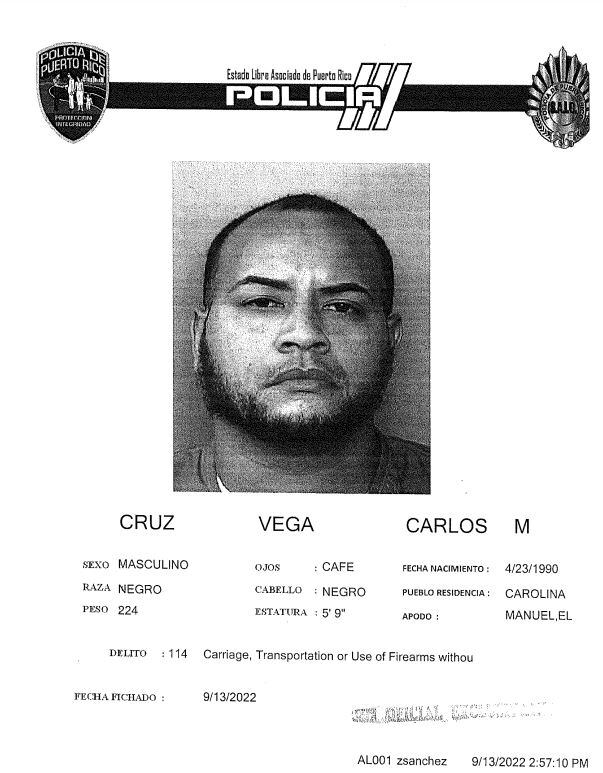 La División de Robos del Cuerpo de Investigaciones Criminales de San Juan, en conjunto al Departamento de Justicia, radicaron cargos criminales en la tarde de hoy por los delitos de Robo Agravado y Ley de Armas contra, Carlos M. Cruz Vega de 32 años y residente de Carolina, quien cometió los delitos en la calle Loíza, cerca de un restaurante en San Juan.