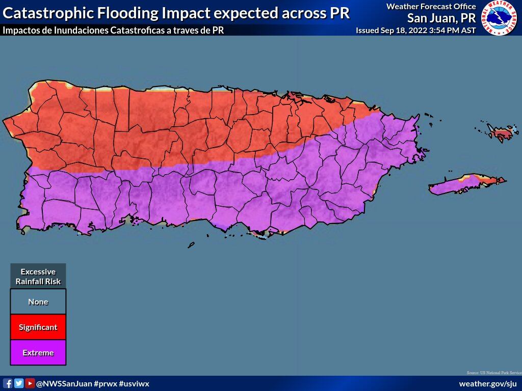 “Se esperan impactos de inundaciones catastróficas a través de la Cordillera Central y el Eeste/Sur de Puerto Rico”, lee la comunicación. Se acompaña con un mapa en el que se indica que todas las zonas en color violeta están bajo riesgo de las inundaciones catastróficas.