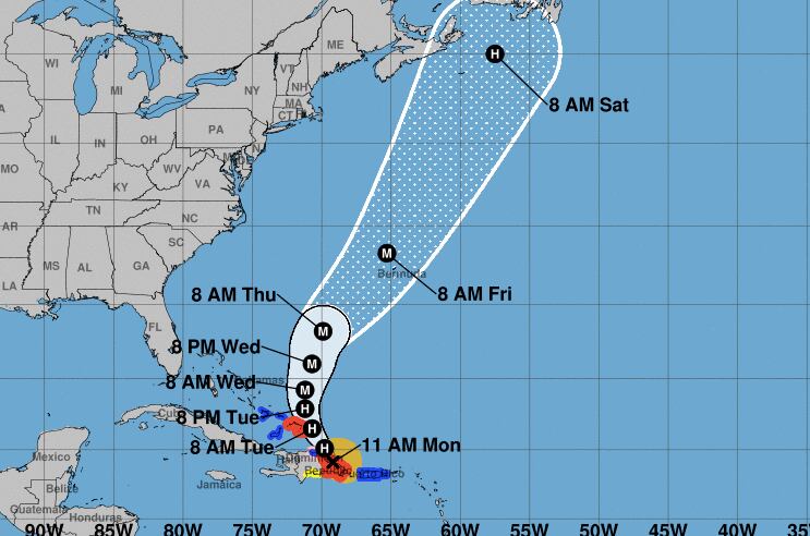 Según el boletín de las 11:00am, el sistema se encuentra en la latitud 19.1 norte, longitud 69.2 oeste y se mueve hacia el noroeste a 8 millas por hora. El sistema mantiene vientos sostenidos de 85 mph.