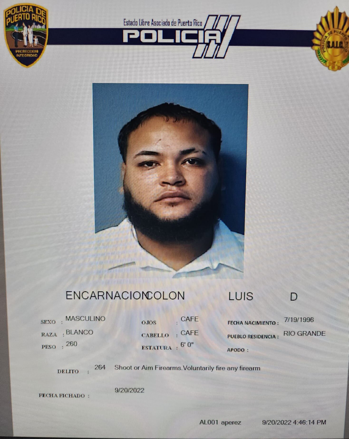Surge de la investigación que el arrestado, identificado como Luis Daniel Encarnación Colon, de 26 años, en unión a otra persona, utilizando varias armas de fuego, le hizo múltiples disparos a la víctima, identificado como Erick S. Gonzalez Benitez, de 27 años, ocasionándole la muerte.