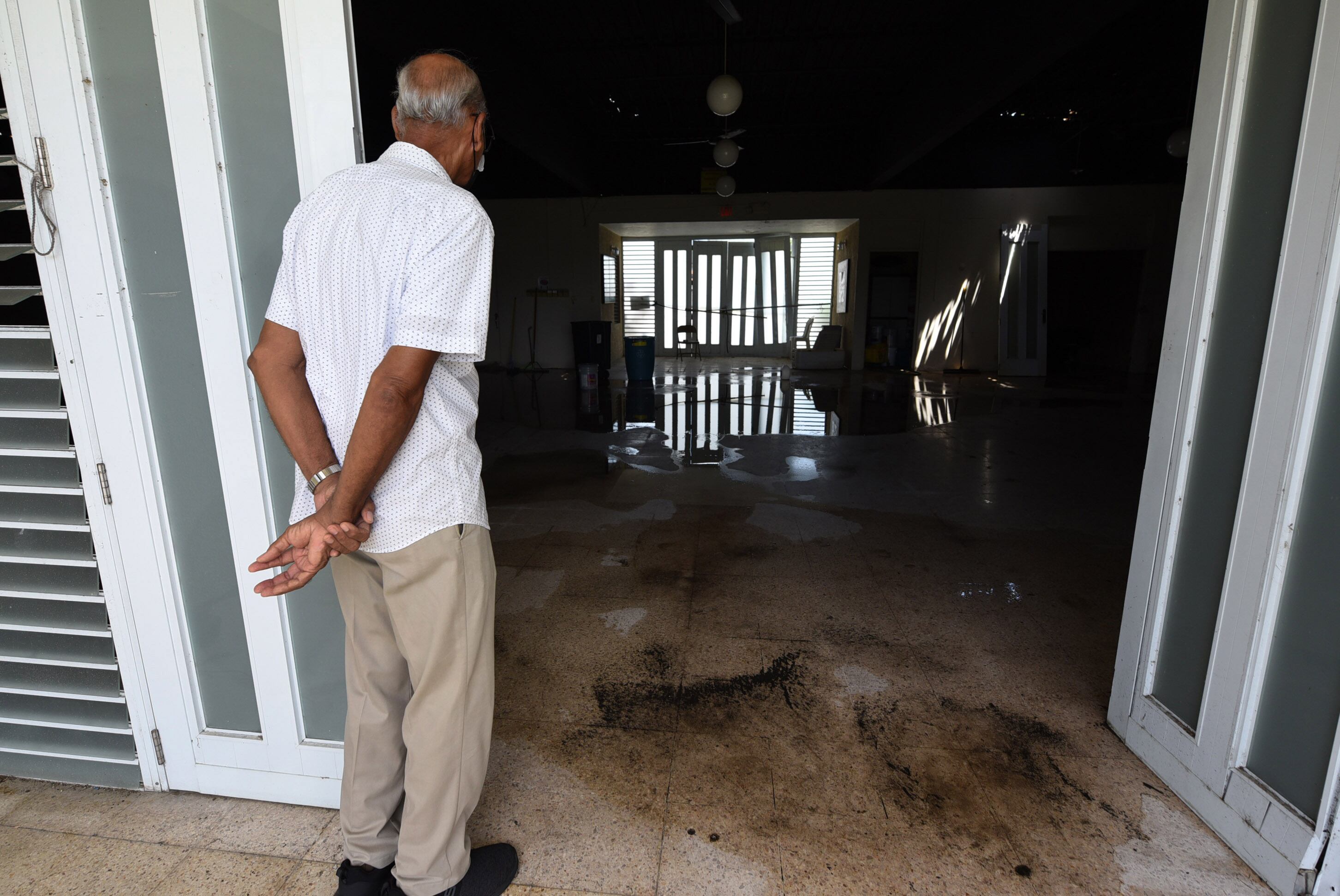 En el interior del centro, 10 zafacones y tres cubos todavía recogen el agua que se filtra desde el techo. Charcos en el piso evidencian que necesita repararse. Las puertas blancas de aluminio aún lucen golpeadas por los vientos sostenidos del huracán María que allí alcanzaron las 120 millas por hora. Una oficina se transformó en una covacha oscura para almacenar un escritorio, archivos, decoración navideña, una impresora y el monitor de las cámaras de seguridad que se dañaron tras el temporal.