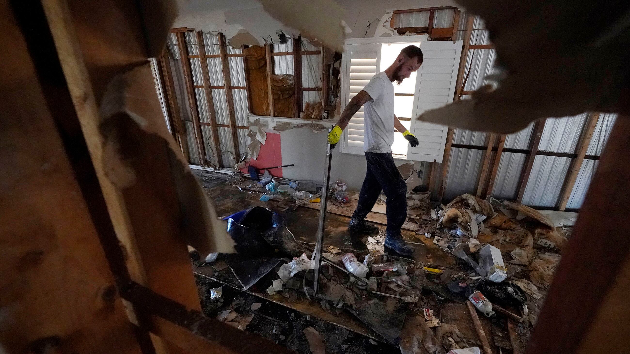 Un trabajador recoge escombros de una casa rodante que resultó dañada por el huracán Ian, el jueves 6 de octubre de 2022, en Fort Myers Beach, Florida. (AP Foto/Wilfredo Lee) AP (Wilfredo Lee/AP)
