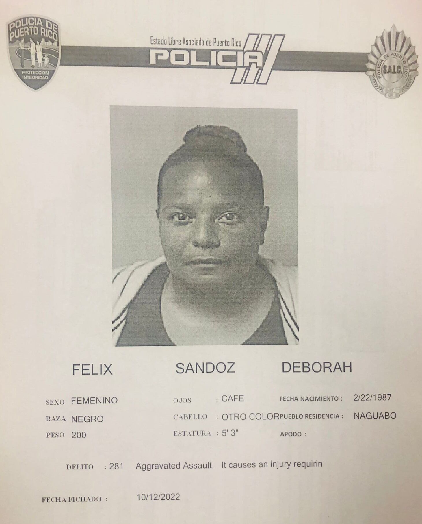 Se trata de Deborah Félix Sandoz, quien el pasado 2 de octubre agredió con los puños a otra fémina en un garaje de gasolina ubicado en el municipio de Naguabo.