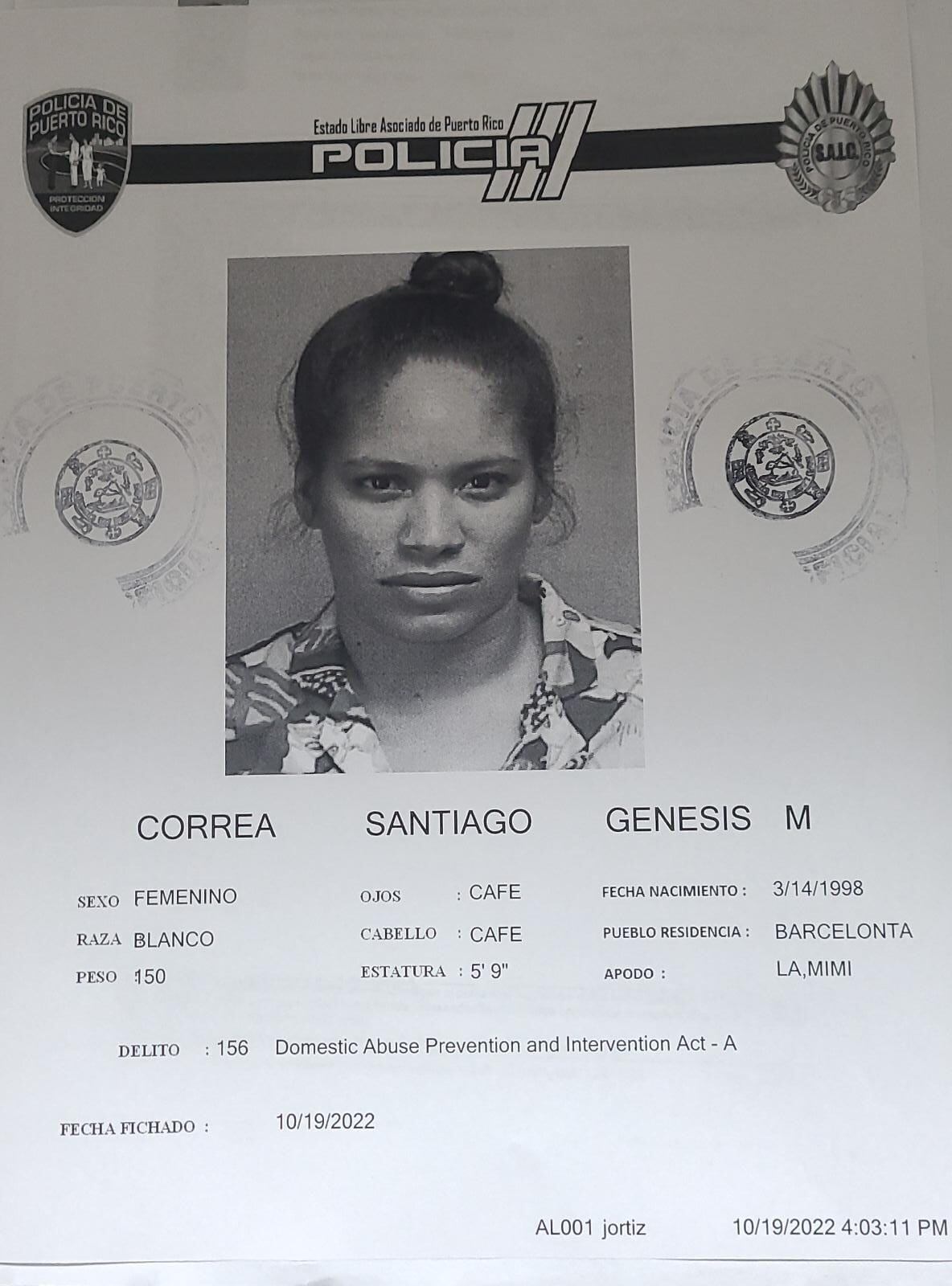 Las autoridades informaron que contra Génesis M. Correa Santiago, 24 años y residente de Barceloneta, pesaba una orden de arresto con una fianza de $25 mil, por el delito de maltrato de la Ley 54 y daños, expedida por la juez Cyndia Irizarry Casiano, del Tribunal de Arecibo.
