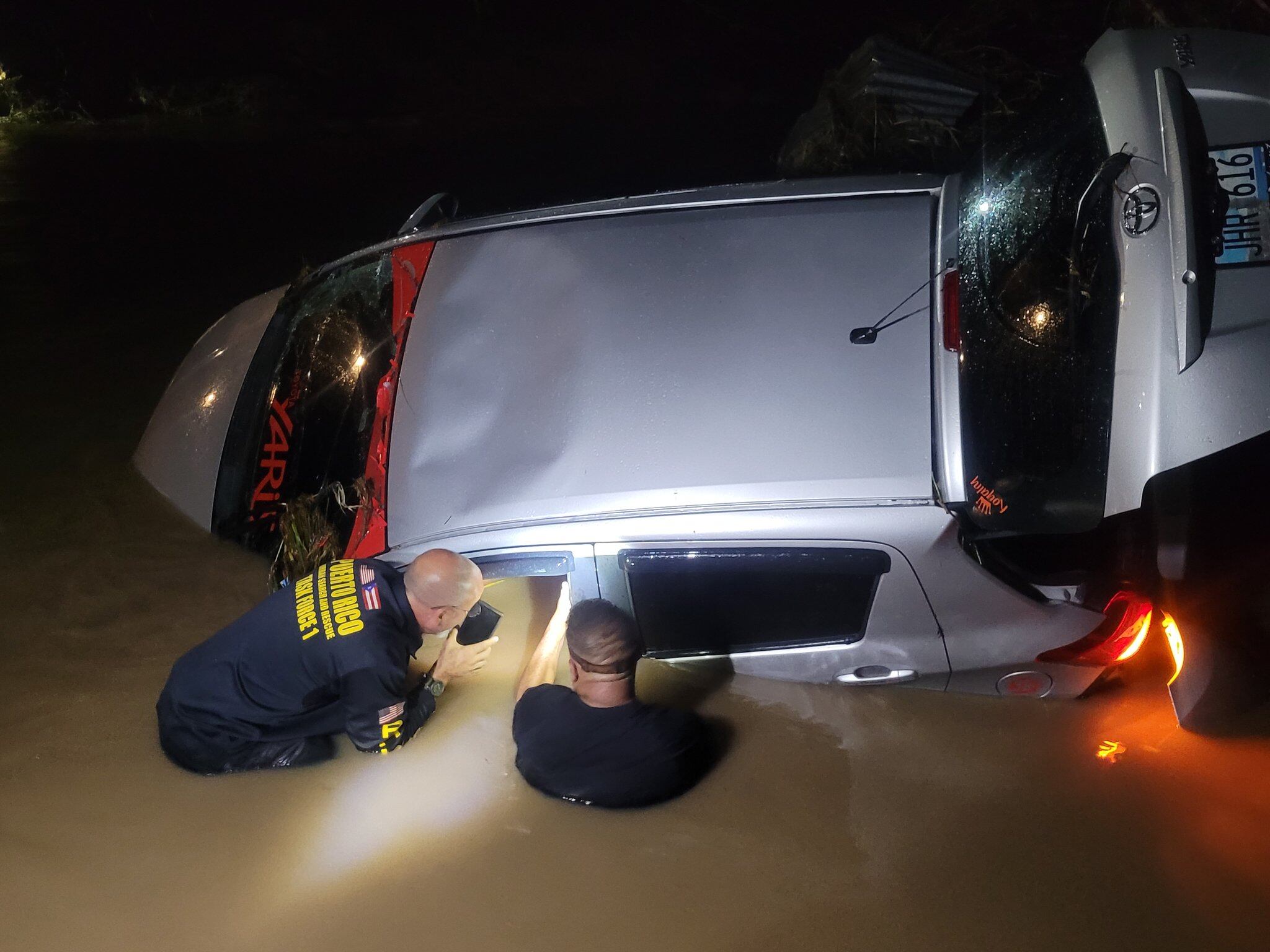Personal de rescate y buzos del Negociado para el Manejo de Emergencias y Administración de Desastres (NMEAD) junto con Personal de la Fuerza Especial de Búsqueda y Rescate Urbano (PRUSAR) trabajan en la búsqueda de la mujer que se encontraba dentro del vehículo y que tiene alrededor de 47 años.