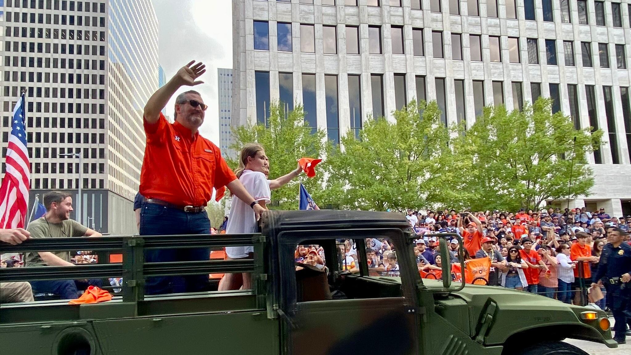 Ted Cruz, senador republicano de Texas, fue golpeado con una lata de cerveza mientras estaba en el desfile de la victoria de la Serie Mundial del lunes para los Astros de Houston.
