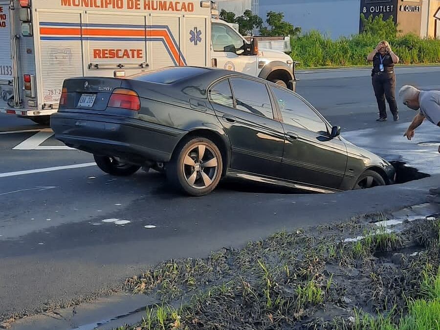 Las autoridades trabajan en una situación ocurrida en el municipio de Humacao donde un vehículo cayó en un enorme hueco en la carretera.