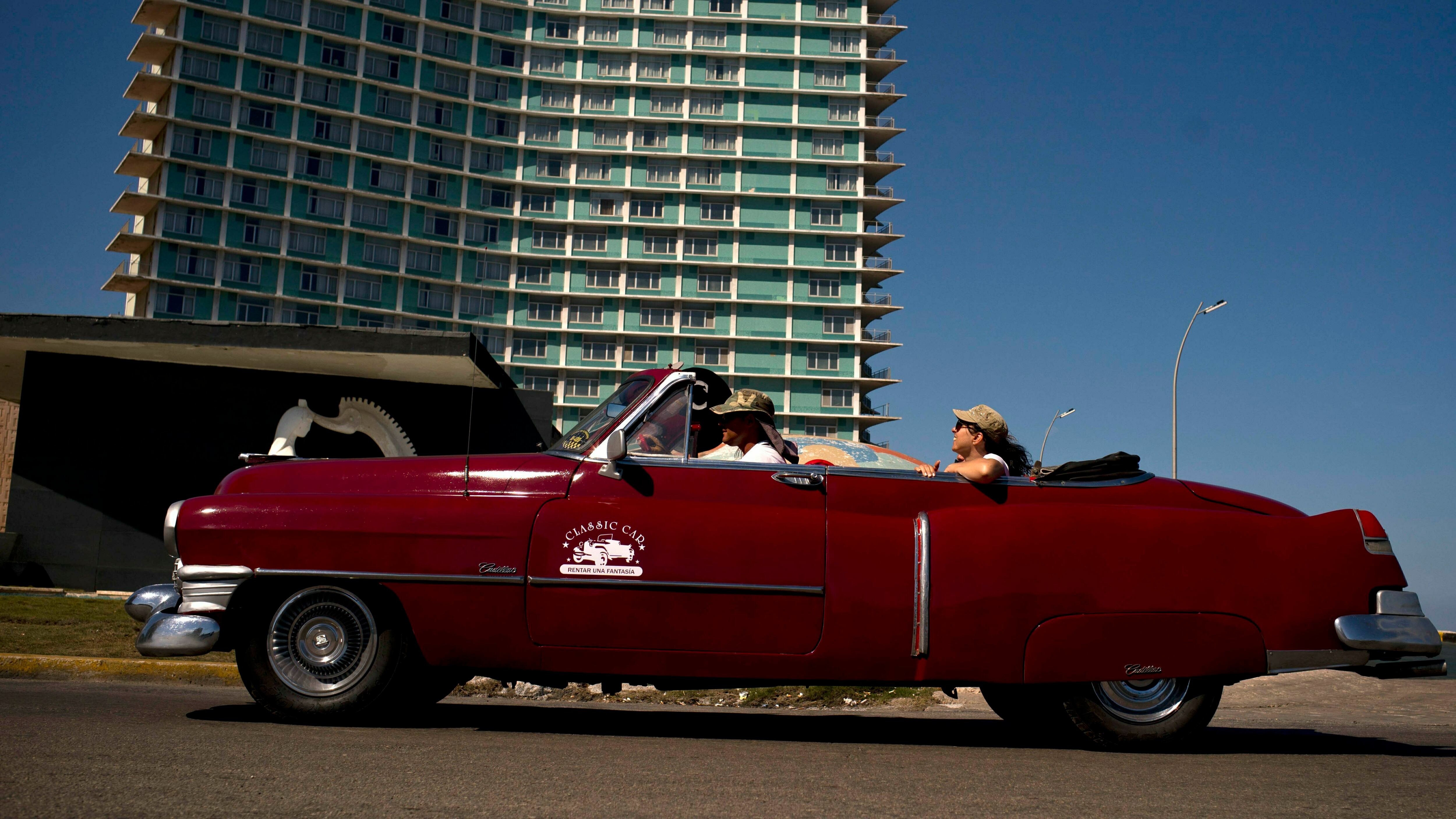 ARCHIVO - Un automóvil estadounidense antiguo traslada a unos turistas frente al hotel Riviera, en La Habana, Cuba, el 24 de abril de 2019. (AP Foto/Ramón Espinosa) AP (Ramon Espinosa/AP)