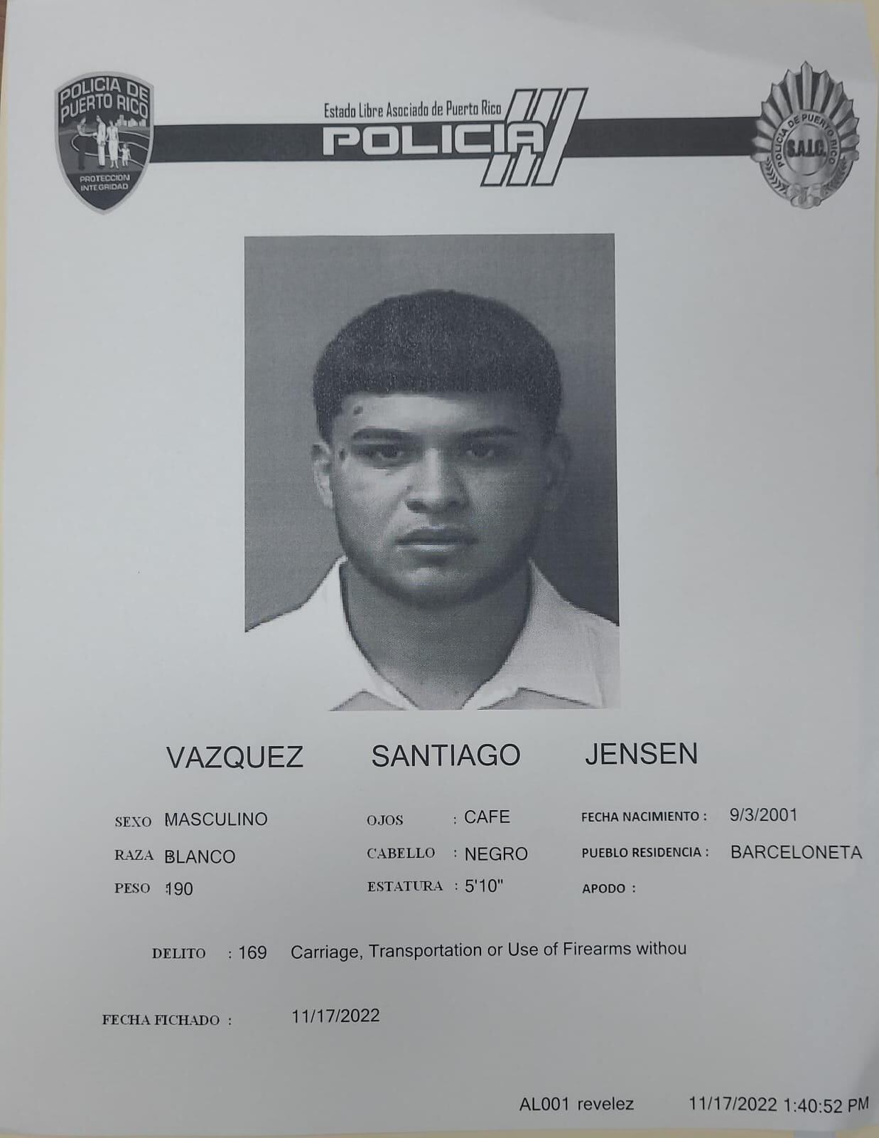 Según la información policiaca, el individuo, identificado como Jensen Vázquez Santiago de 21 años, ya una orden de arresto con una fianza de $250 mil, por los delitos de violación a la Ley de Armas y empleo de violencia o intimidación contra la autoridad pública.