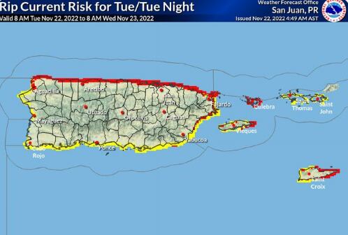 Existe riesgo de moderado a alto de corrientes marinas para la mayoría de las playas del este y norte de Puerto Rico, incluyendo Vieques y Culebra hasta mitad de semana.