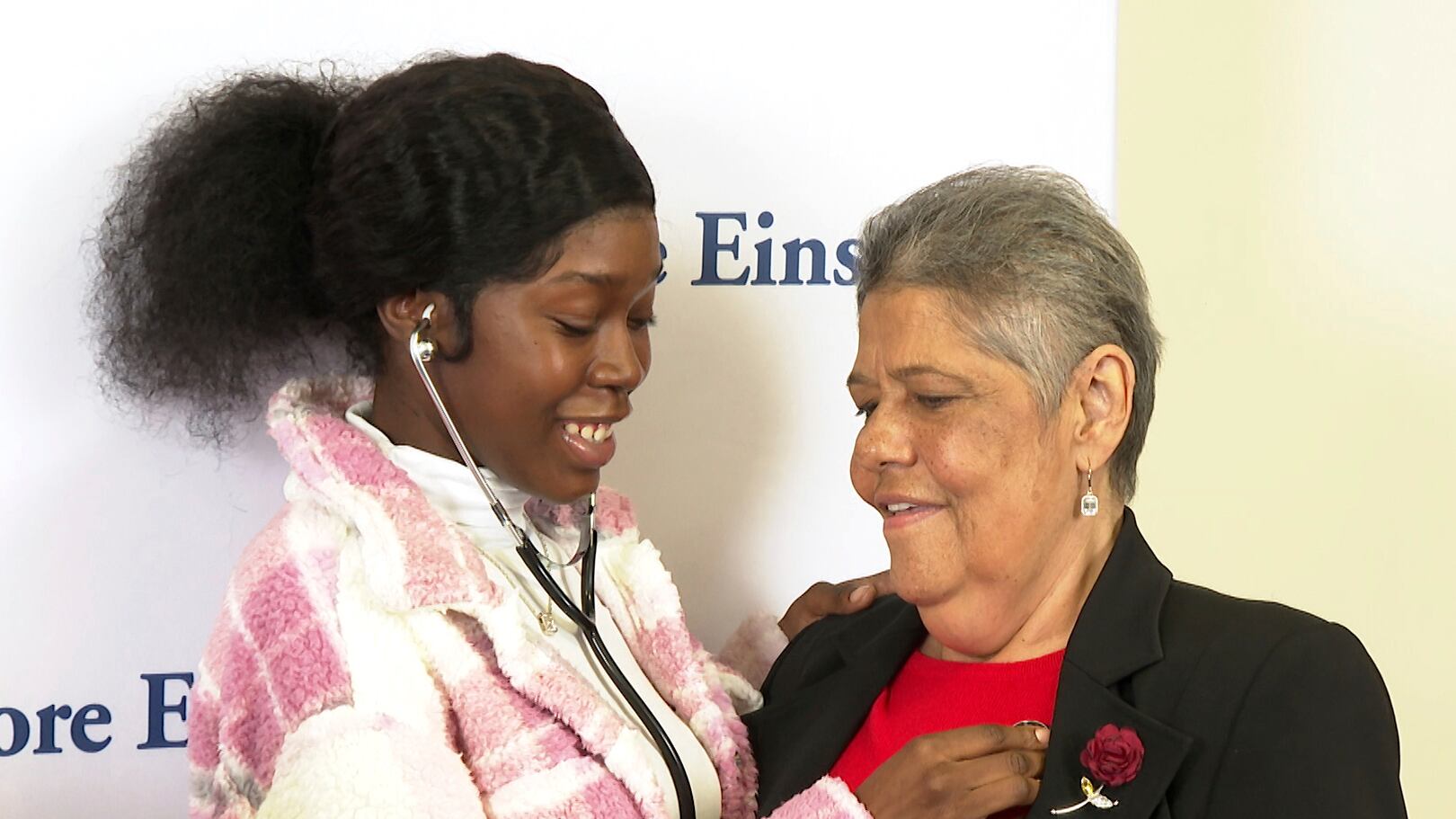 Las hermanas de Newton, Breanne y Brianca Newton, escucharon con un estetoscopio cómo latía el corazón. Breanne Newton dijo que no le sorprendió cuando escuchó a Nieves decir que se sentía con más energía desde el trasplante.