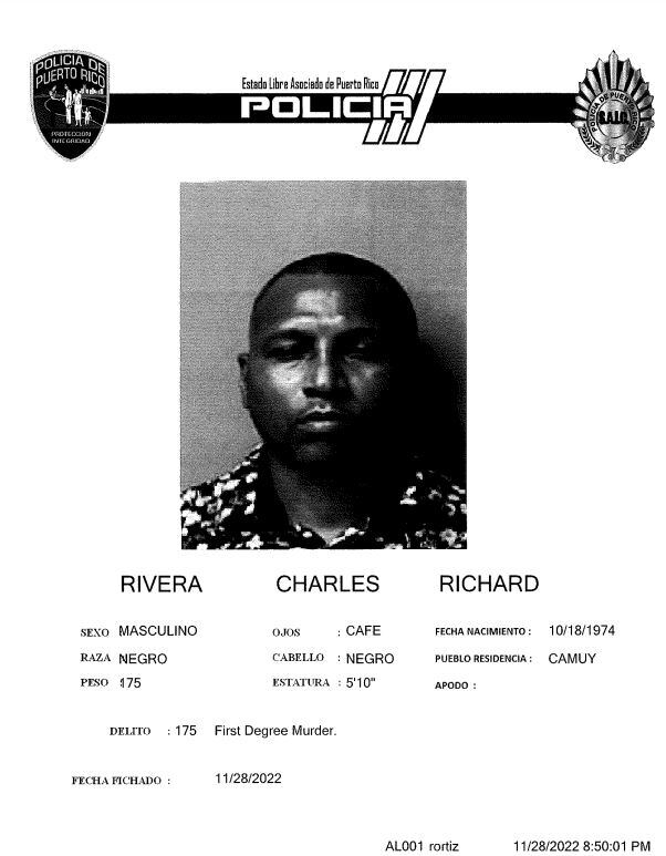 Surge de la investigación, que el pasado sábado en horas de la madrugada, Luis Juan Vélez González, de 51 años y residente de Pensilvania, se encontraba en el interior del Colmado Cafetín Las Piedras, cuando Rivera Charles le disparó. Vélez González resultó con un impacto de bala en el área del rostro que le causo la muerte en el acto. En adición, Rivera Charles se apropió de la cámara de seguridad del negocio.