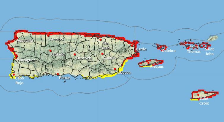 Un aviso de resacas fuertes y de inundaciones costeras permanece en efecto. Olas rompientes de 15 a 20 pies han de esperarse en Culebra, Vieques y el norte de Puerto Rico, incluyendo a Aguada y Rincón. Se espera oleaje de 12 a 15 pies en aguas del Atlántico y los pasajes. Se esperan condiciones peligrosas y amenazantes a la vida en estas áreas. Se debe ejercer precaución y mucho juicio de tener planes cerca del agua.