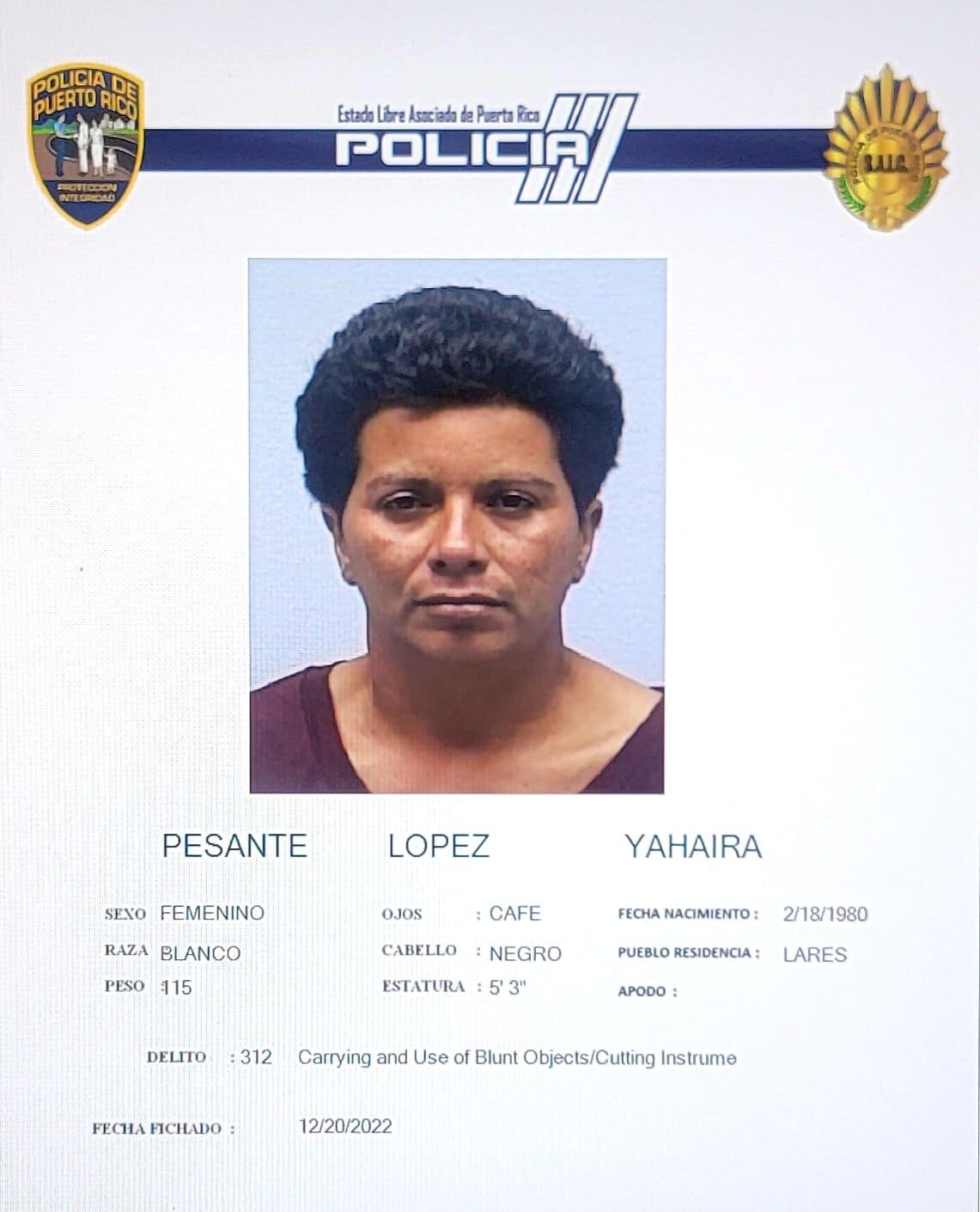 Surge del informe de la Policía, que ayer en el sector Las Minas de Lares, la mujer, identificada como Yahaira Pesante López, sostuvo una discusión con sus vecinos y armada de un machete los amenazó. Luego, lanzó una piedra hacia el vehículo Mazda 3 del año 2013, ocasionándole daños al cristal delantero.