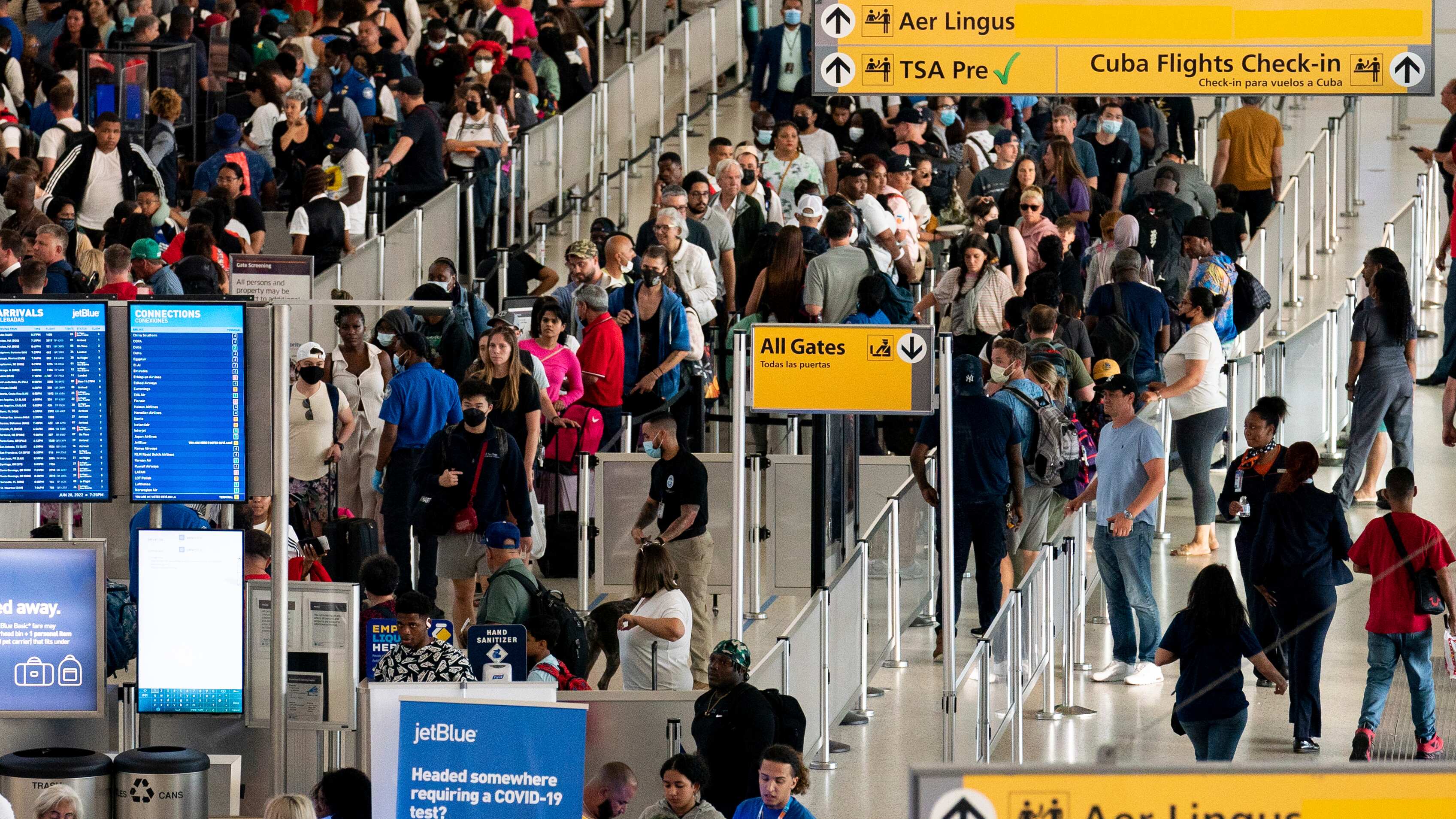 ARCHIVO - La gente espera en la fila de la Administración de Seguridad del Transporte (TSA) en el Aeropuerto Internacional John F. Kennedy el 28 de junio de 2022, en Nueva York. (AP Foto/Julia Nikhinson, Archivo) AP (Julia Nikhinson/AP)