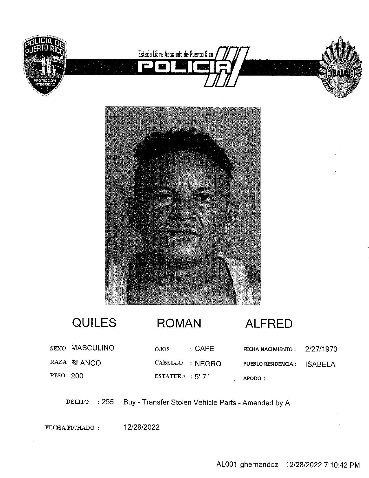 El imputado, identificado como Alfred Quiles Román, cometió los hechos, a las 12:50 de la madrugada de hoy, en el Bo. Arenales Bajos de Isabela, donde fue sorprendido, en posesión de un vehículo Mitsubishi Lancer, año 2003, hurtado en horas de la madrugada, en el Bo. Arenales Bajos de esa población, a un residente de ese municipio, quien reportó los hechos a la policía local.
