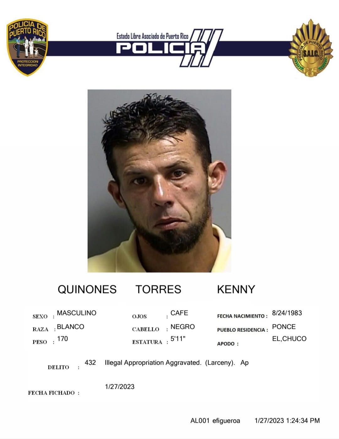 Agentes del Negociado de la Policía de Puerto Rico, adscritos al Cuerpo de Investigaciones Criminales de Ponce, realizaron una investigación que culminó en la radicación de cargos por escalamiento contra Kennedy Quiñones Torres, apodado “Chuco”, de 39 años y vecino de Ponce.