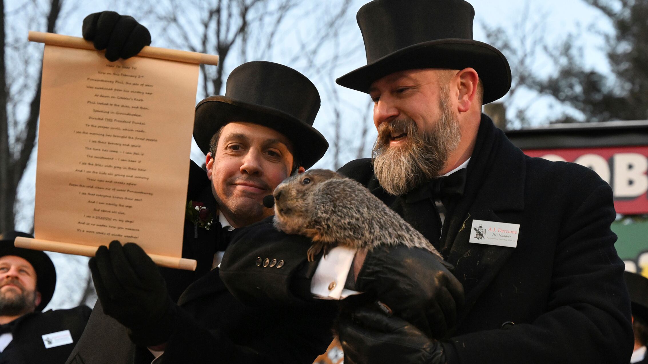 La gente se congregó en Gobbler’s Knob donde los miembros del “círculo íntimo” de Punxsutawney Phil convocaron a la marmota oculta en su tronco de árbol para ver si ha visto su sombra, y dijeron que así fue. La tradición dice que si ve su sombra habrá seis semanas más de invierno, y si no, la primavera llegará anticipadamente.